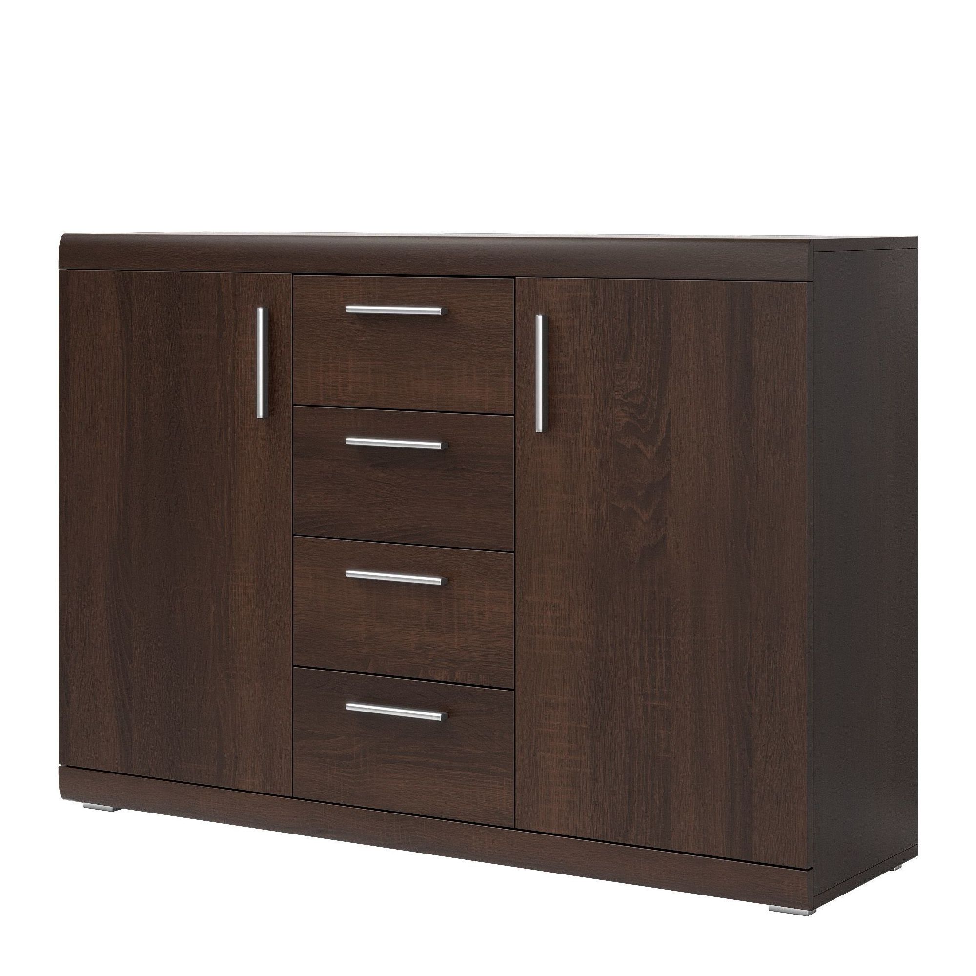 Szeroka, pojemna komoda z systemu mebli Mestre, utrzymana w modnym wybarwieniu dąb sonoma ciemny. Wykonana z laminowanej płyty meblowej, odpornej na uszkodzenia i zarysowania. Srebrne, podłużne uchwyty i nóżki podkreślają elegancki charakter komody, z ozdobne, zaoblone listwy wykończeniowe nadają jej subtelności. Mebel posiada 4 szuflady i 2 drzwiczek – wewnątrz 2 półki.