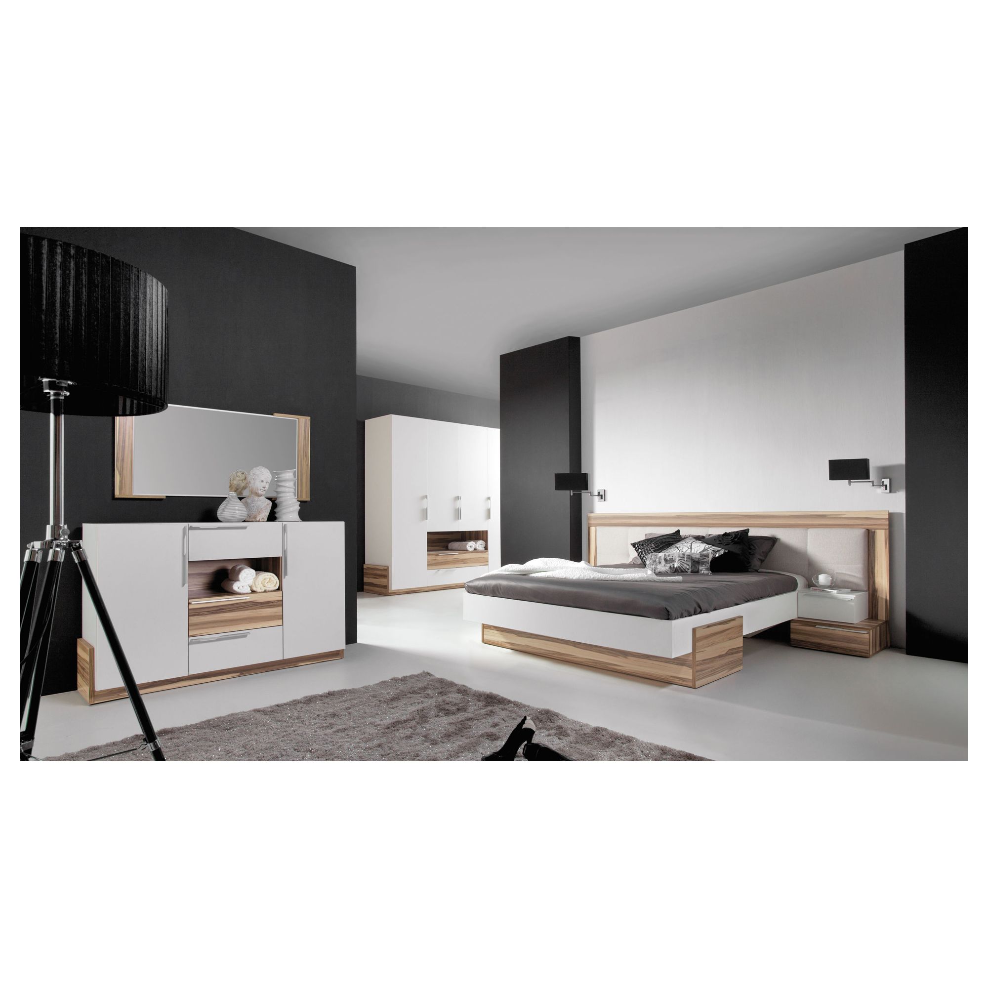 Twoim marzeniem jest nowoczesna sypialnia, w której poczujesz się komfortowo? Twoim oczekiwaniom sprosta niezwykły sypialniany zestaw Morena, który zachwyca pod każdym względem. Solidne wykonanie z dużą dbałością o najmniejszy szczegół, oraz użycie w produkcji najwyższej jakości materiałów i komponentów sprawia, że zyskujesz meble na lata. Kolejnym walorem jest modna kolorystyka. Piękny, dający poczucie ciepła Orzech Baltimore możesz połączyć z ponadczasową bielą lub magiczną czernią. W zestawie Morena znajdziesz meble, które pozwolą Ci na maksymalne, a przy tym praktyczne, wykorzystanie powierzchni jaką dysponujesz: komfortowe łóżko, oryginalne szafki nocne, praktyczną, dużą komodę oraz czterodrzwiową szafę. Natomiast duże, okazałe lustro z pięknym obramowaniem powieszone nad komodą stworzy toaletkę, pozwalając Pani domu na wykonanie codziennego makijażu. Zestaw sypialnianych mebli Morena to sposób na stworzenie aranżacji, która będzie spełnieniem Twoich marzeń.