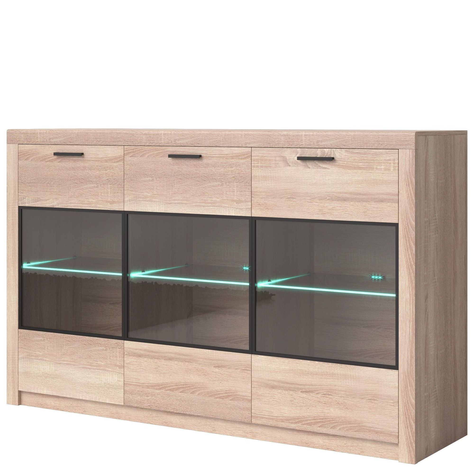 Kredens Nemezis to propozycja dla tych, którzy cenią sobie solidne lecz niebanalne meble. Sprawdzi się jako element wyposażenia pokoju dziennego. Ciepłe wybarwienie dąb sonoma jasny wniesie do pomieszczenia przyjemną atmosferę, a przeszklone fronty z podświetlonymi półkami pozwolą w wyjątkowy sposób wyeksponować Twoje ulubione przedmioty. Kredens wykonany został z odpornego na zarysowania, wilgoć i promienie słoneczne laminatu, z pogrubionymi profilami MDF i metalowymi uchwytami. Mebel posiada 3 drzwiczek, wewnątrz 3 półki. Oświetlenie LED oraz system cichego zamykania drzwiczek w standardowym wyposażeniu.