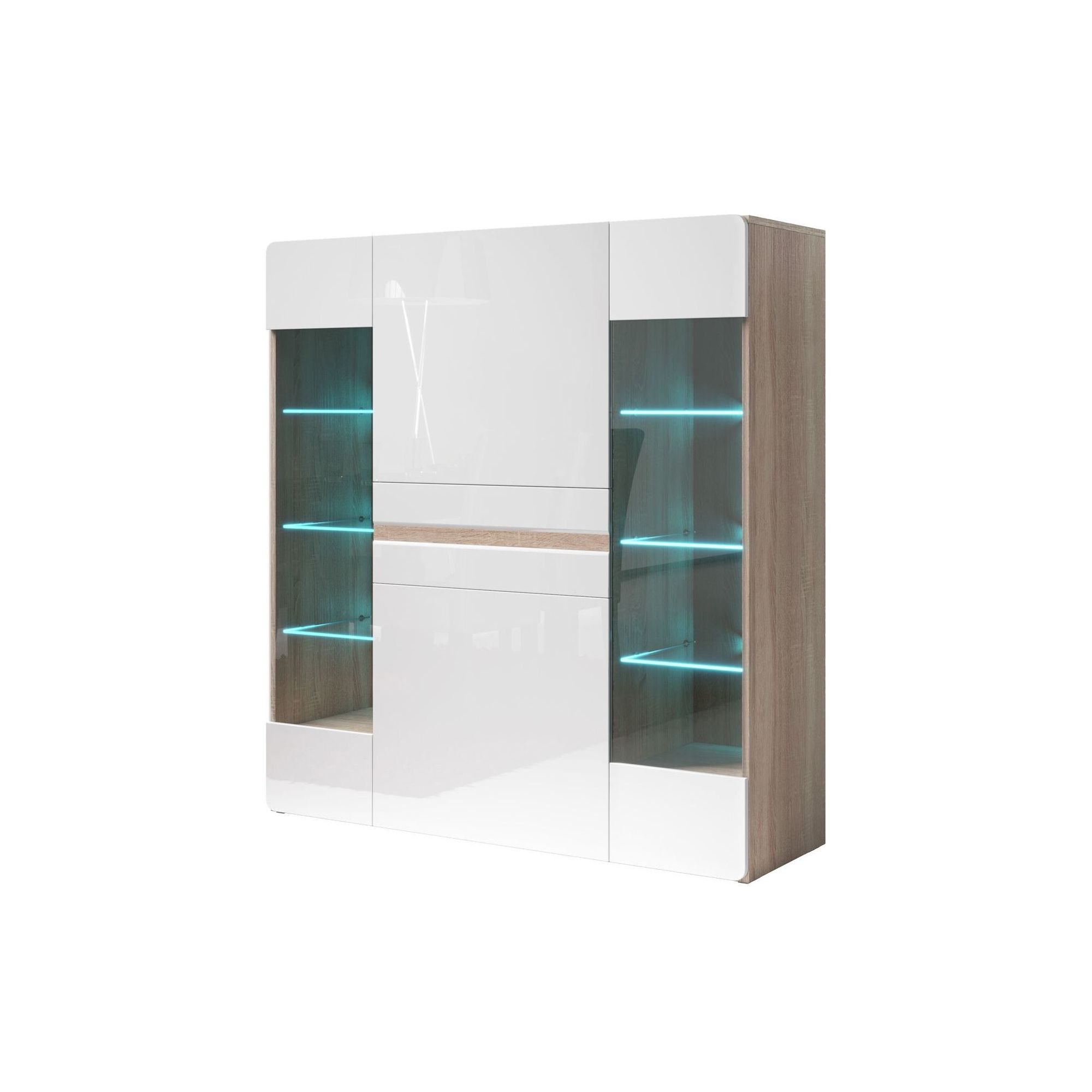 Wysoki i szeroki barek Selene to mebel nietypowy i wyjątkowy nie tylko ze względu na funkcjonalną formę, ale również wysoką jakość użytych do produkcji materiałów. Korpus w kolorze drewna uzupełniono frontami w wysokim połysku z ozdobną wstawką. Barek posiada 4 drzwiczek i szufladę z wygodnym systemem otwierania PUSH (otwieranie na dotyk). Wewnątrz 6 szklanych i 2 pełne półki.