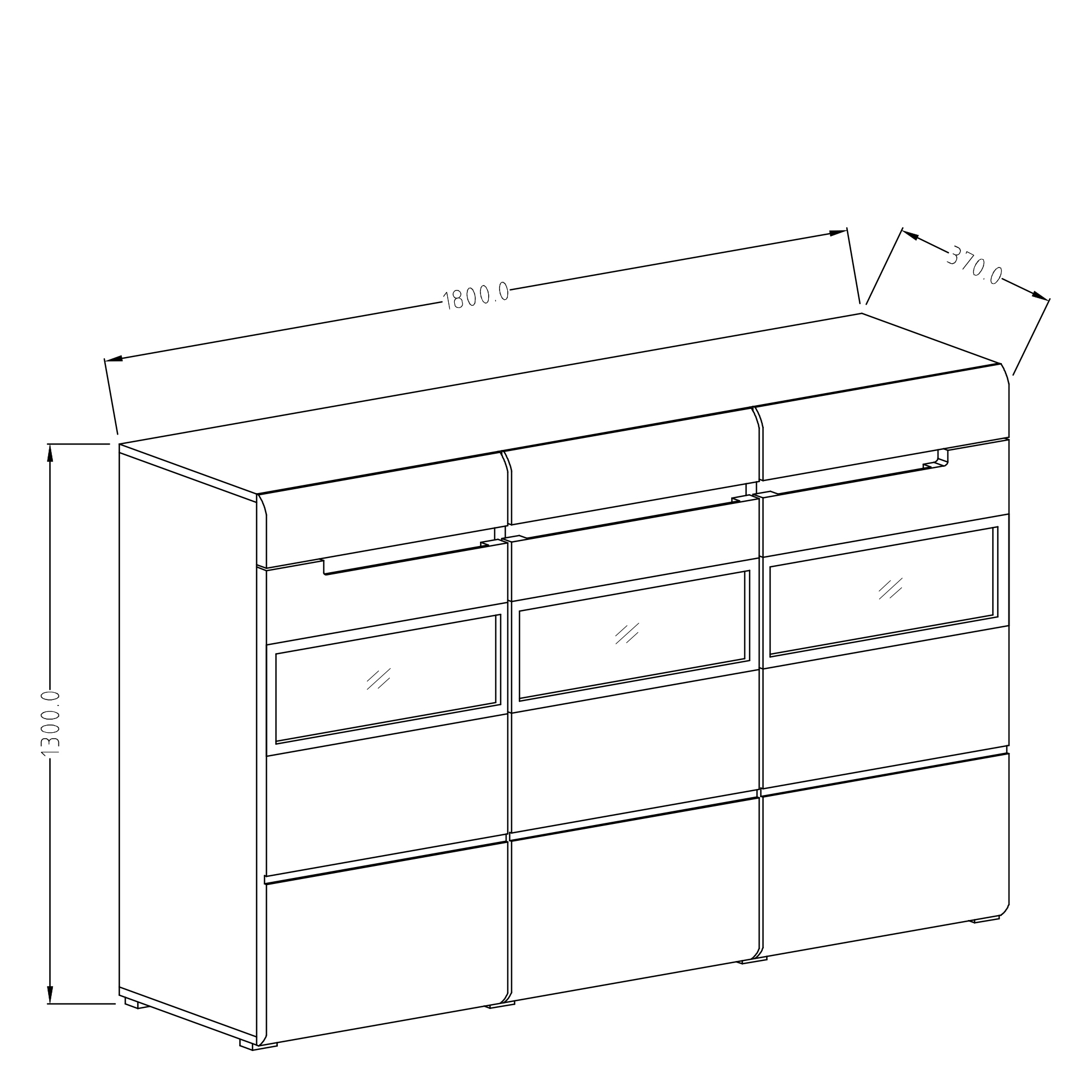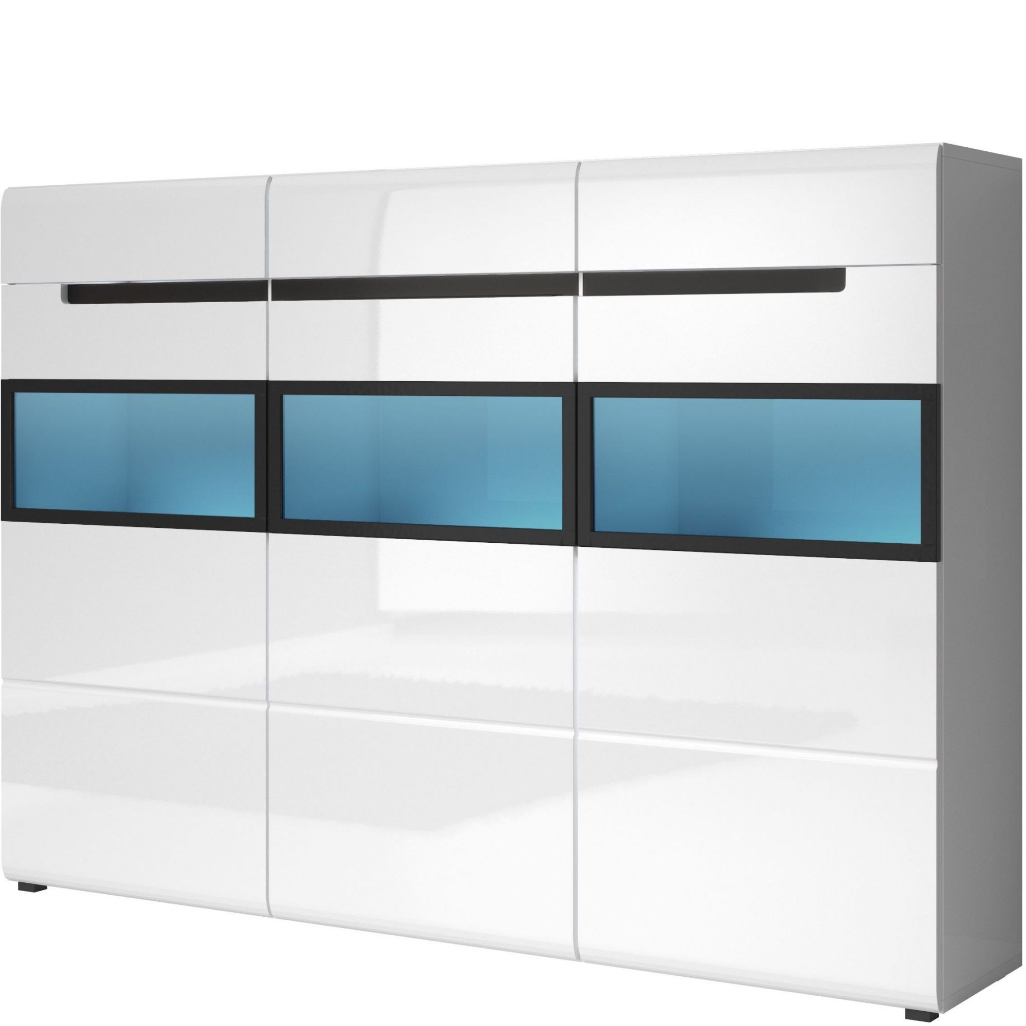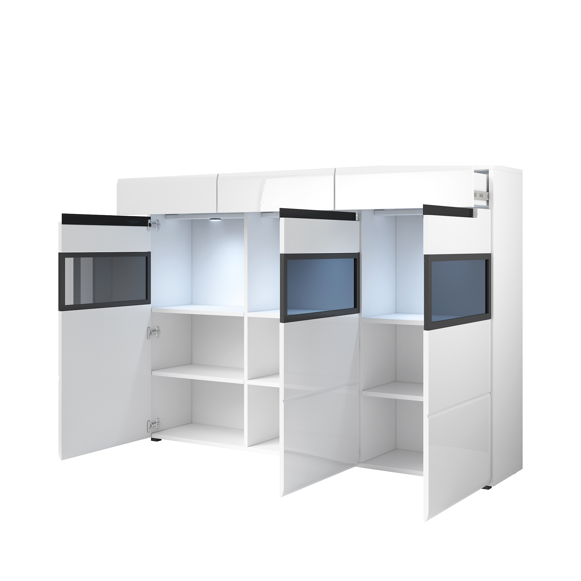 Pojemny kredens Hektor wyróżnia się nie tylko modną, kontrastową kolorystyką, ale również częściowo przeszklonym frontem. Wykonana z węglowego szkła szyba została osadzona w czarnej aluminiowej ramie. Białe wybarwienie mebla, z połyskującym frontem, uzupełnia frezowany uchwyt z czarną wstawką oraz delikatne, poziome ryflowania drzwiczek, dające wrażenie ich segmentowej budowy. Kredens posiada 3 szuflady i 3 drzwiczek, wewnątrz 6 półek. Energooszczędne oświetlenie LED dla wnętrza komody dostępne za dopłatą.