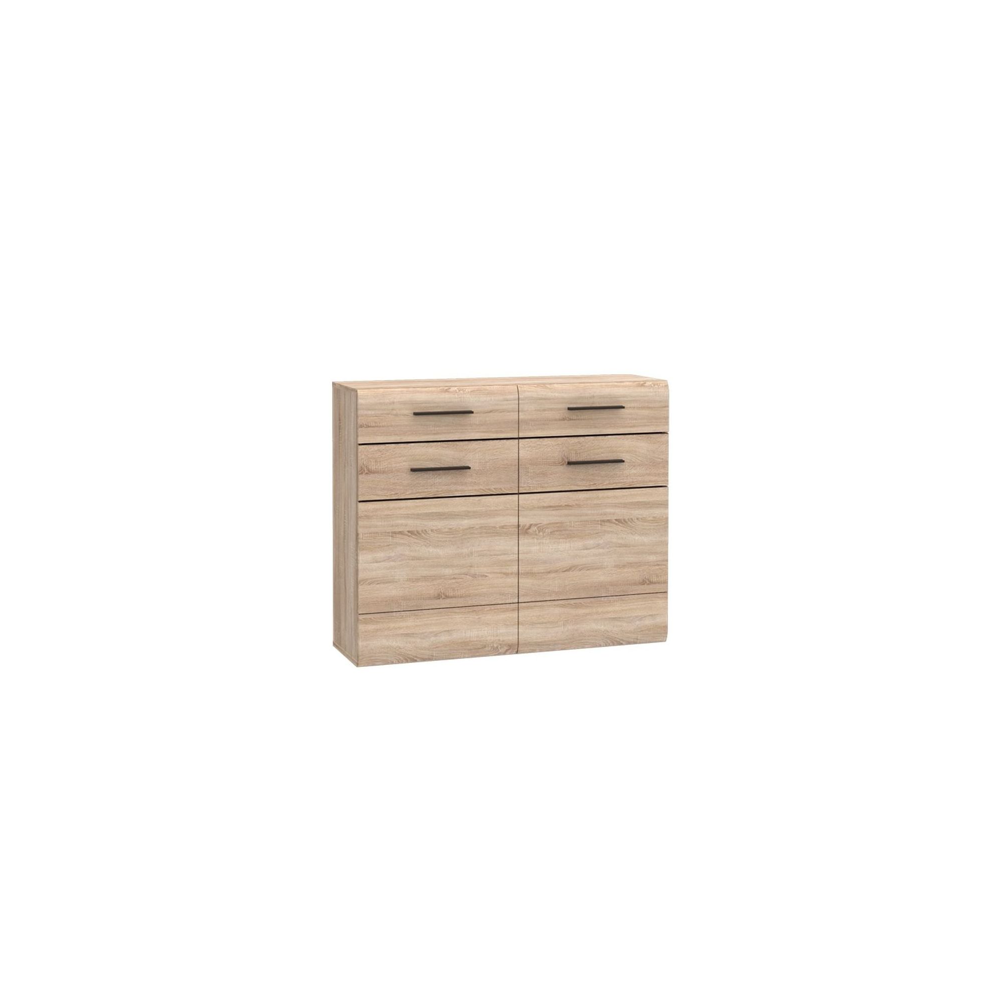 Szafka na buty z kolekcji Combino to sposób na praktyczne zaaranżowanie przedpokoju. Mebel dostępny jest w modnym, ponadczasowym dekorze Dąb Sonoma, a segmentowa konstrukcja frontu stanowi jego ciekawą ozdobę. Poziome frezy oraz wnętrze bryły wykonano w kontrastowym kolorze Wenghe, a uchwyty w kształcie klepsydry są barwione na Dąb Melinga. Taka kolorystyka doda elegancji każdemu wnętrzu. Szafka posiada dwie szuflady i dwie uchylne klapy do przechowywania obuwia.