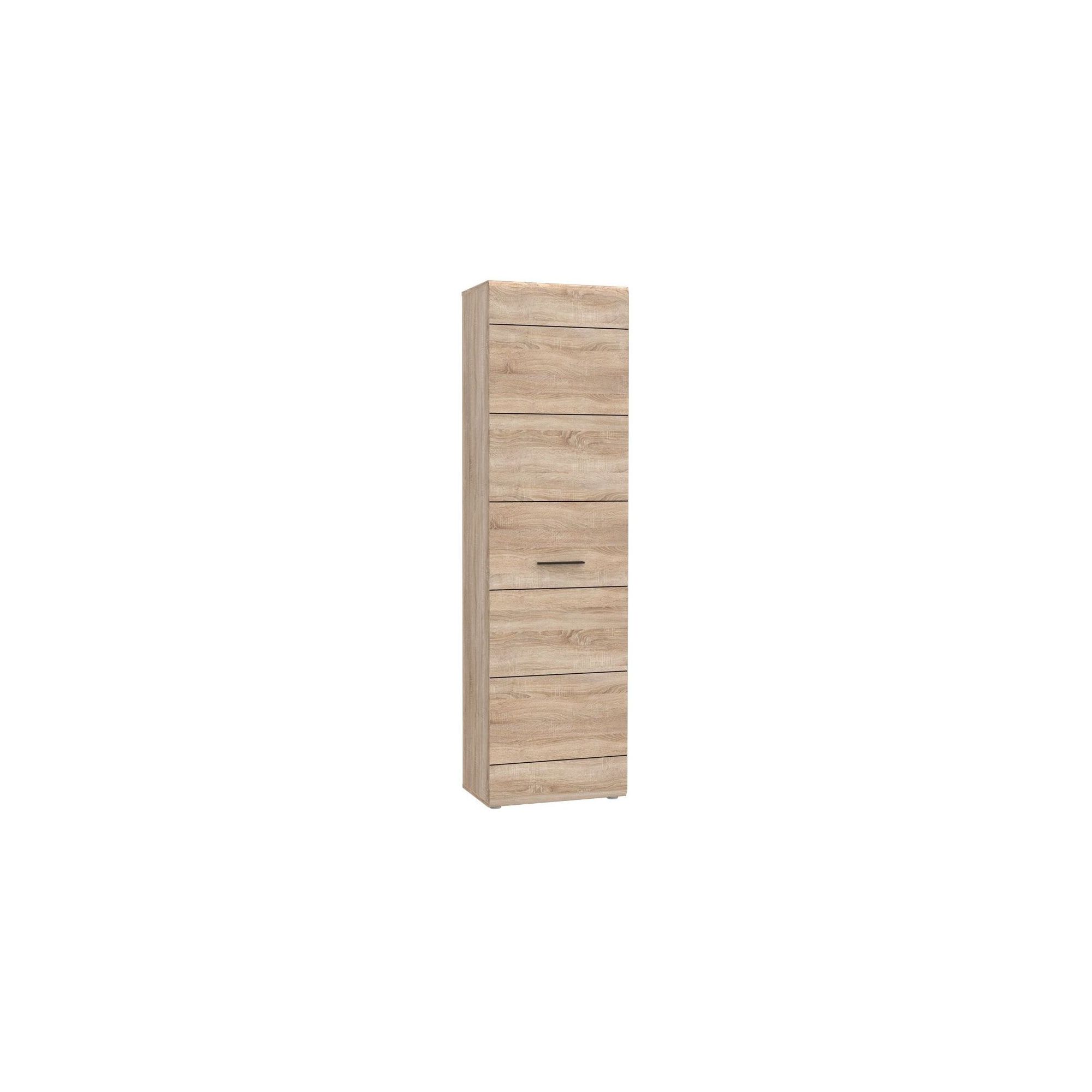 Wąska szafa na ubrania z kolekcji Combino to mebel stworzony do aranżacji przedpokoju. Wbrew swoim rozmiarom jest bardzo pojemna - wewnątrz zajdziesz drążek na wieszaki i górną półkę. Geometryczną konstrukcję bryły podkreślają poziome frezowania frontu i ozdobny uchwyt. Całość wykonana w przyjemnej kolorystyce Dębu Sonoma, który doskonale dopasuje się do wystroju zarówno tradycyjnych, jak i nowoczesnych wnętrz.