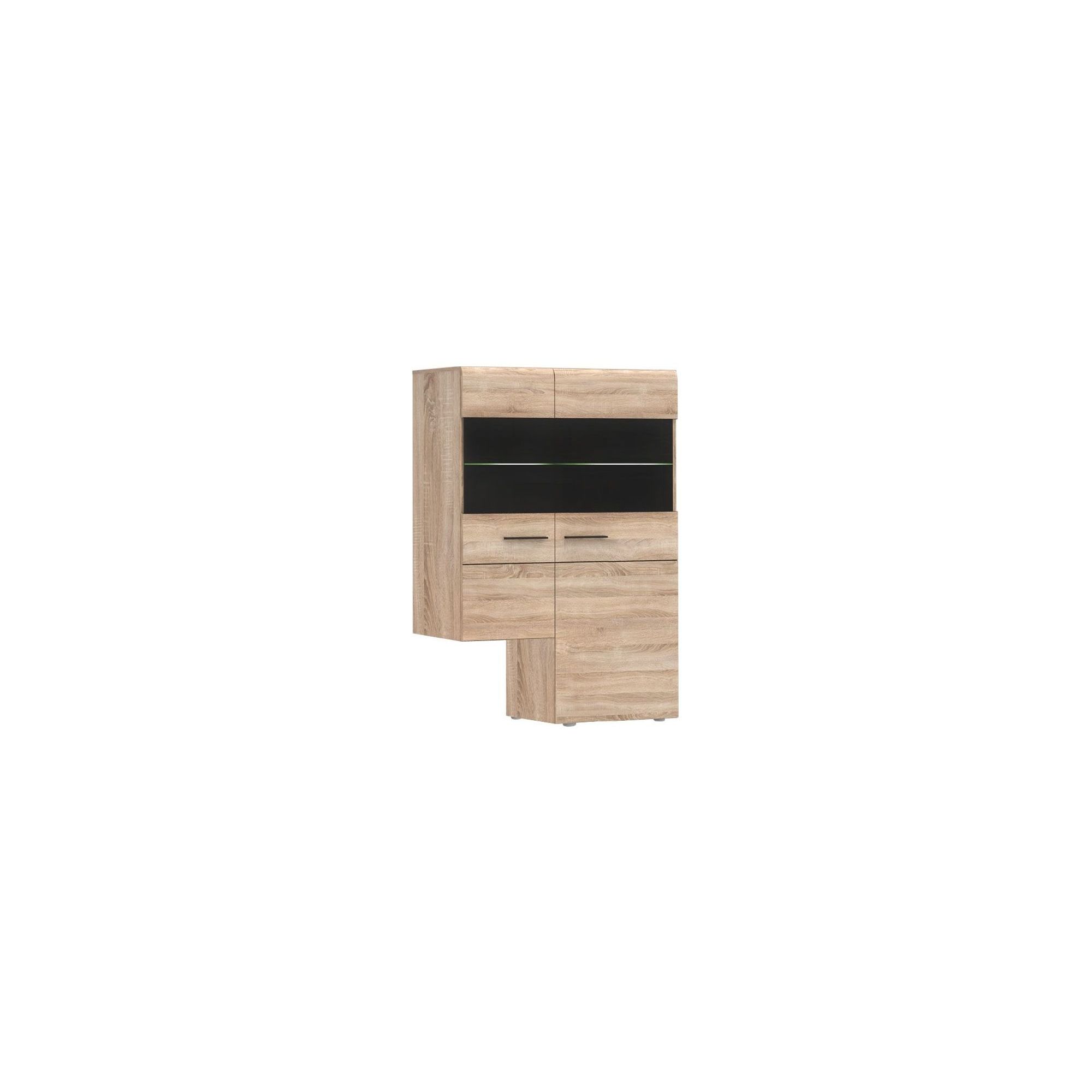 Nadstawka TV z kolekcji Combino to stylowa propozycja do salonu. Wykonana została w modnym dekorze Dębu Sonoma. Segmentową konstrukcję dwudrzwiowego frontu podkreślają ciemne wykończenia, natomiast wnętrze wybarwiono w kontrastowym kolorze Wenghe. Dostępne w opcji podświetlenie szklanych półek podkreśli urok przechowywanych przedmiotów.