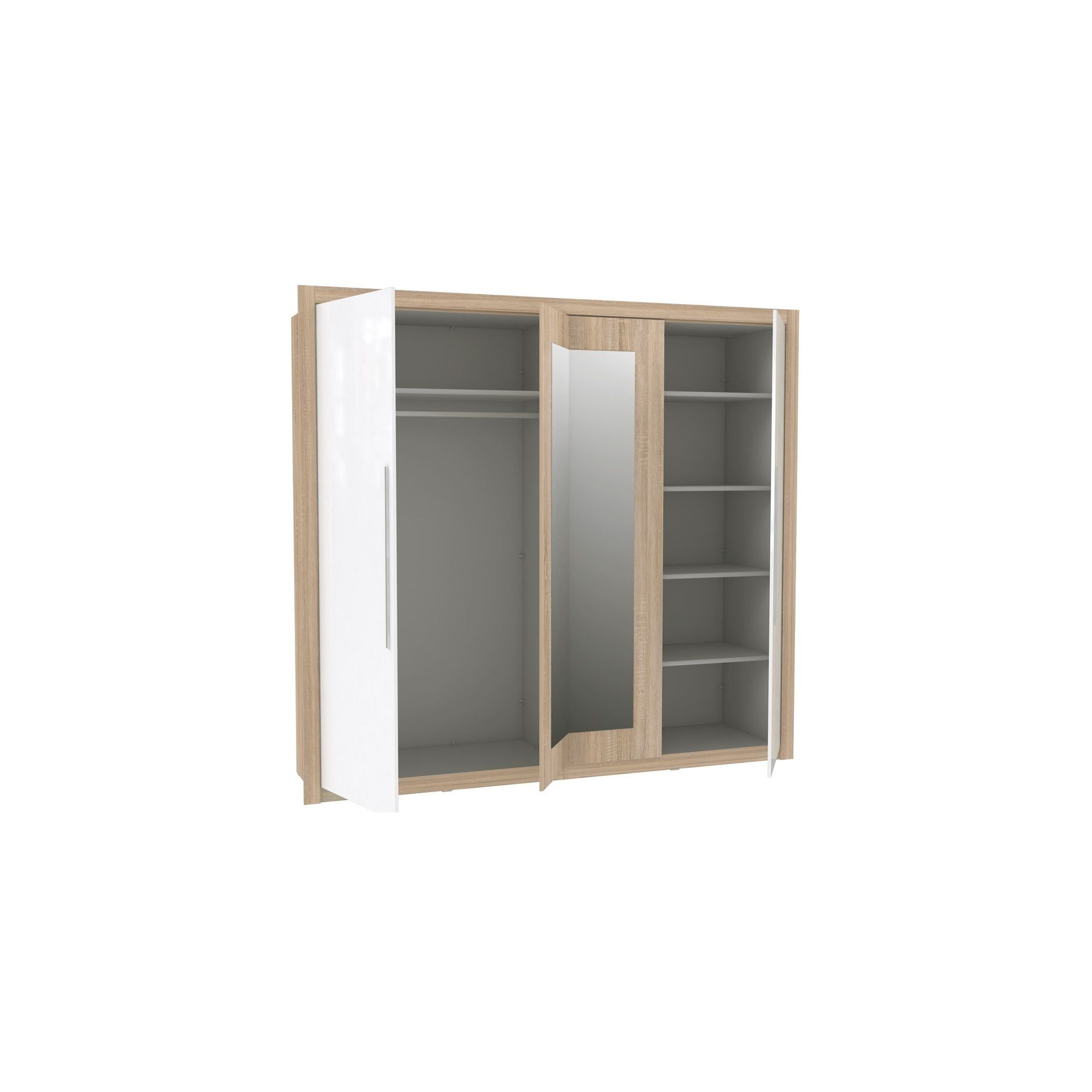 Pojemna szafa to niezbędny element każdej sypialni czy garderoby. Czterodrzwiowy model z kolekcji Julietta bez trudu pomieści wszystkie elementy Twojej garderoby. Na wyposażenie wnętrza szafy składa się drążek na wieszaki i cztery szerokie półki. Korpus i środkowe drzwi mebla zostały wykonane w przyjemnym dekorze Dębu Sonoma, który doskonale uzupełnia połyskującą powierzchnię białych frontów. Dodatkowo na środkowych drzwiach uzmieszczono dwie lustrzane tafle, które optycznie powiększą pomieszczenie.