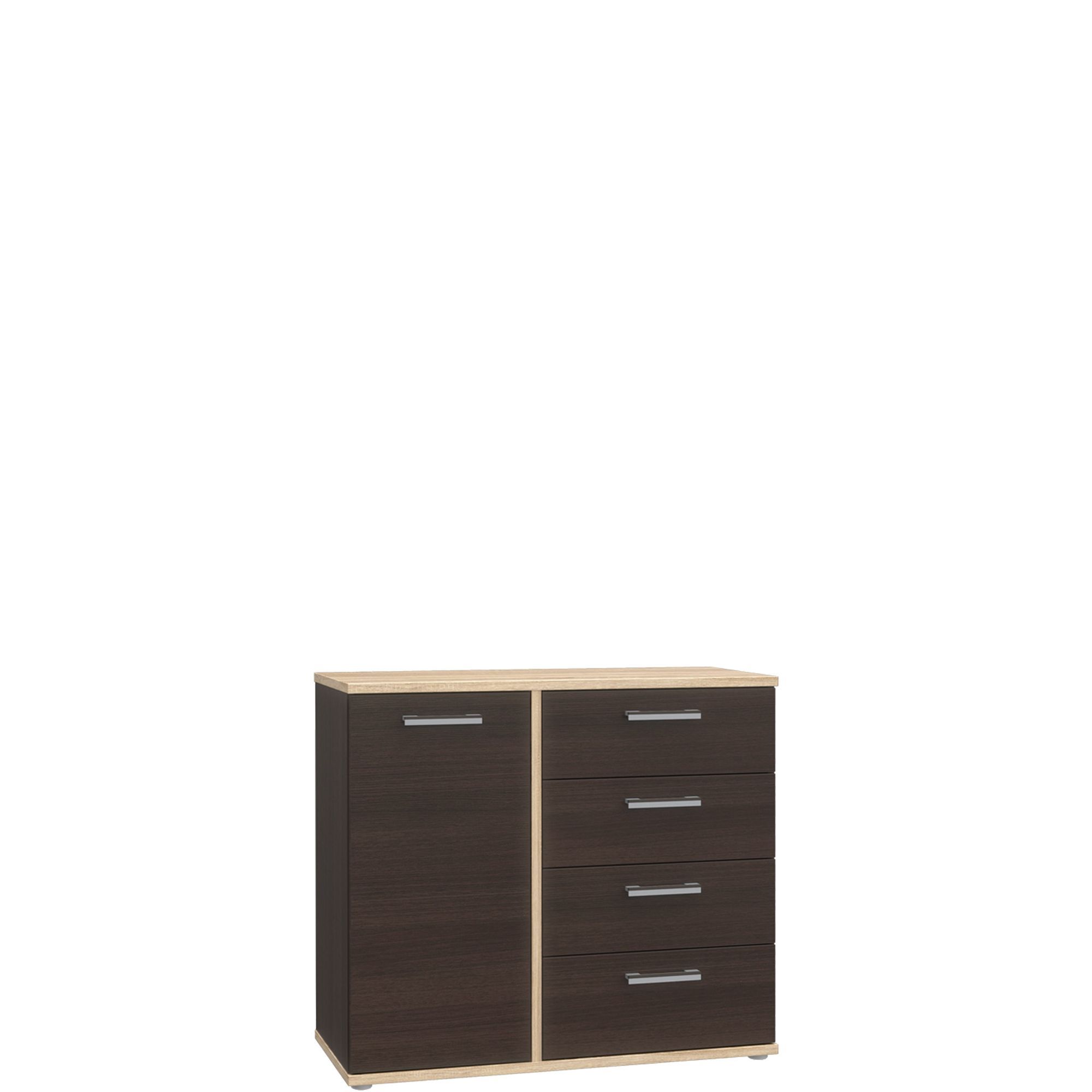 Nowoczesna komoda z kolekcji Kendo to mebel, który wykorzystasz jako element wyposażenia salonu lub jadalni. Komoda składa się z czterech szuflad i zamykanej szafki. Całość wykonana w eleganckim dekorze Dębu Czekoladowego, przełamanego kontrastowym Dębem Sonoma na górnym i dolnym wiencu oraz pionowej wstawce. Uchwyty w kolorze niklu ze wstawkami w kolorze wenge idealnie dopasowano do stylistyki komody. Mebel podkreśli prosty styl wnętrza, a ponadczasowa kolorystyka odnajdzie się w różnych aranżacjach.