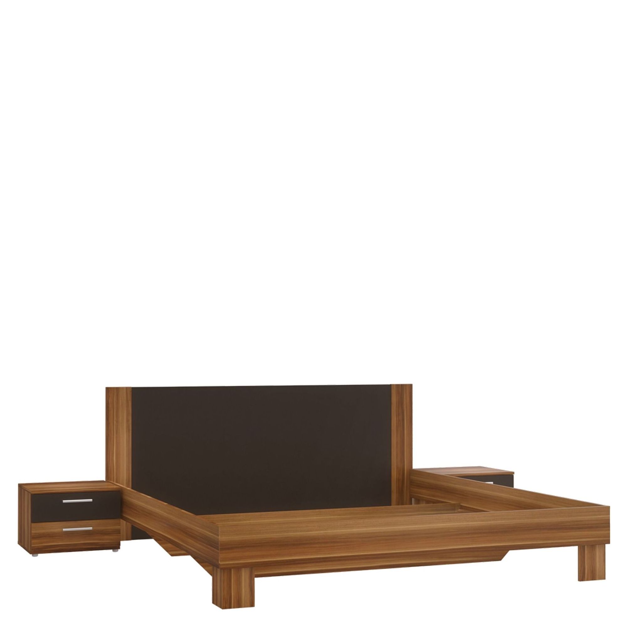 Dwuosobowe łóżko oraz dwie szafki nocne z kolekcji Helen to modny zestaw do nowoczesnej sypialni. Łóżko, mimo iż wykonane w bardzo prostej stylistyce, prezentuje się niezwykle elegancko. Wszystko dzięki idealnemu połączeniu dwóch klimatycznych dekorów: Orzechu Włoskiego i czarnego matu. W komplecie z łóżkiem dostępne są dwie szafki nocne. Każda z nich została wyposażona w dwie szuflady, dzięki którym wszystkie niezbędne podczas wypoczynku przedmioty będziesz mieć zawsze pod ręką.
