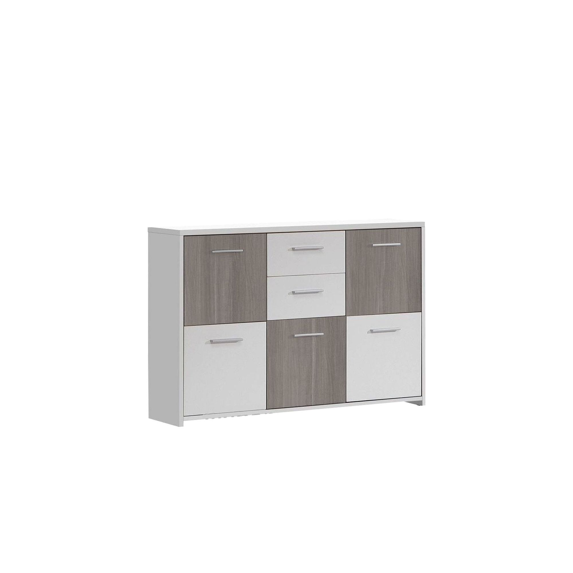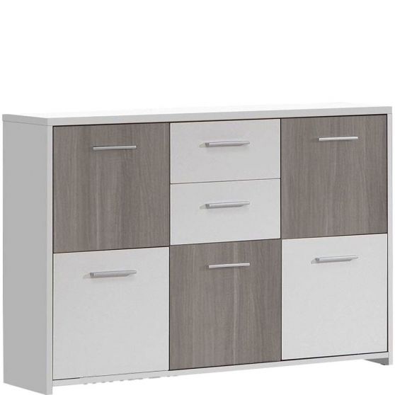 Komoda z kolekcji Quadro pomoże w zagospodarowaniu przestrzeni w salonie, przedpokoju lub garderobie. Matowy front i korpus zostały wykonane w połączeniu bieli z dekorem Orzecha Szarego. Komoda posiada pięcioro drzwiczek i dwie szuflady. Dzięki estetycznemu wykonaniu sprawdzi się również w domowym miejscu pracy i gabinecie.