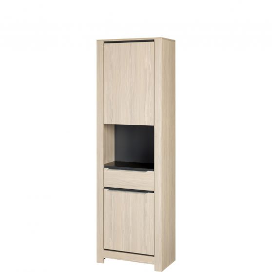 W biurze czy pokoju nastolatka świetnie sprawdzają się wszelkie schowki, w których można uporządkować dokumenty lub drobiazgi. Wysoka szafka z kolekcji Monez została stworzona z myślą o praktycznym zagospodarowaniu przestrzeni. Wyposażona w szufladę z systemem samodomyku, wnękę tworzącą półkę oraz dwoje drzwiczek – górne i dolne, daje dużo różnego rodzaju miejsca do przechowywania. Jest przy tym wąska, dzięki czemu sprawdzi się w pomieszczeniach o różnych rozmiarach. Mebel wykonano z odpornego na zarysowania laminatu o naturalnej strukturze drewna. Przyjemne, jasne wybarwienie sosny avola zestawiono z kontrastową wnęką w kolorze grafitu i poziomymi, srebrnymi uchwytami. Łącząc szafkę z regałem lub witryną z systemu Monez stworzysz funkcjonalny zestaw do swojego biura lub pokoju pociechy.