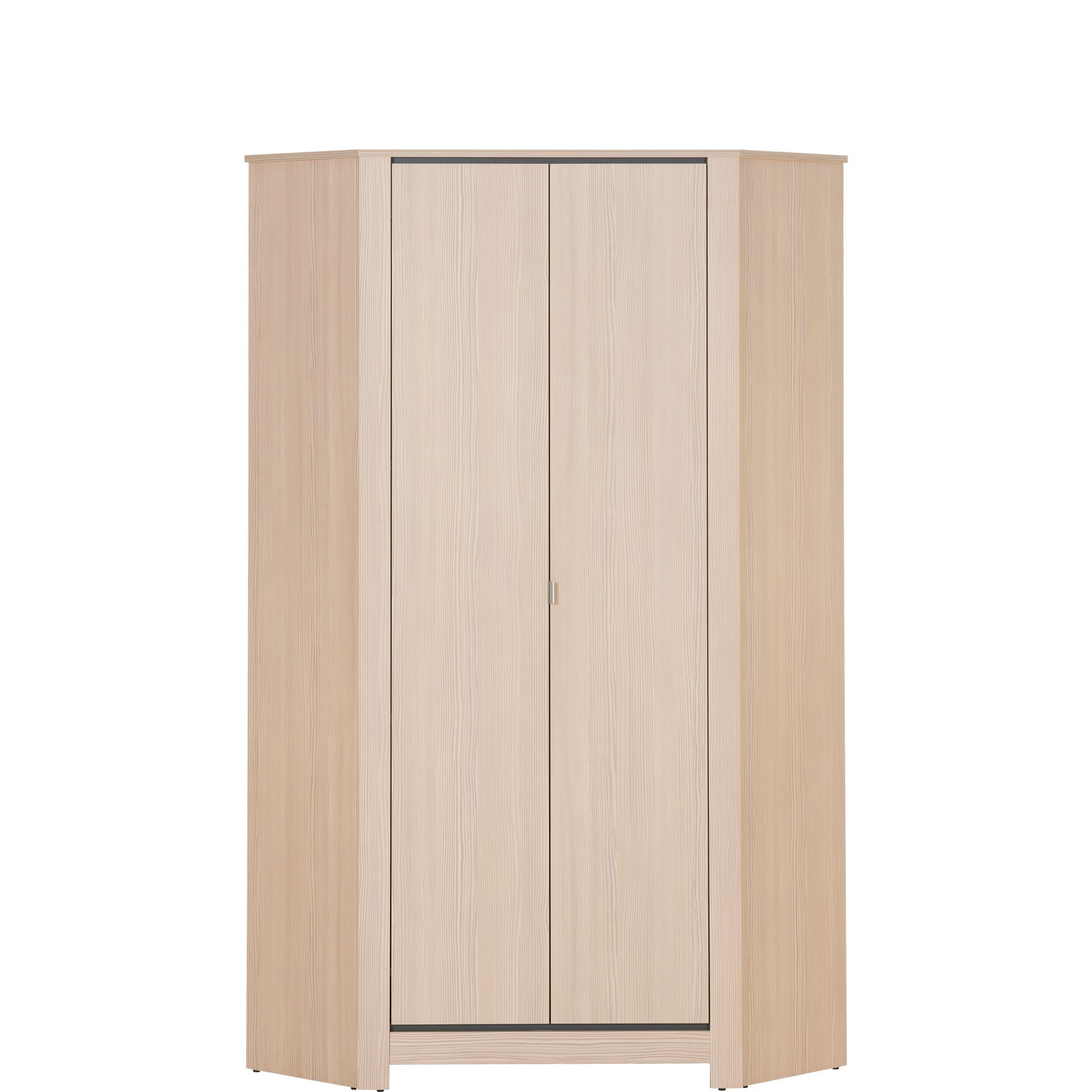 Narożna szafa to doskonały sposób na optymalne zagospodarowanie przestrzeni w pomieszczeniach o różnym rozmiarze. Szafa Monez została wykonana z laminowanej płyty meblowej o naturalnej strukturze drewna. Przyjemne wybarwienie sosna avola, zestawiono z kontrastowymi grafitowymi wstawkami oraz niewielkimi srebrnymi uchwytami. Za 2-drzwiowym frontem znajdziesz 4 półki i drążek.