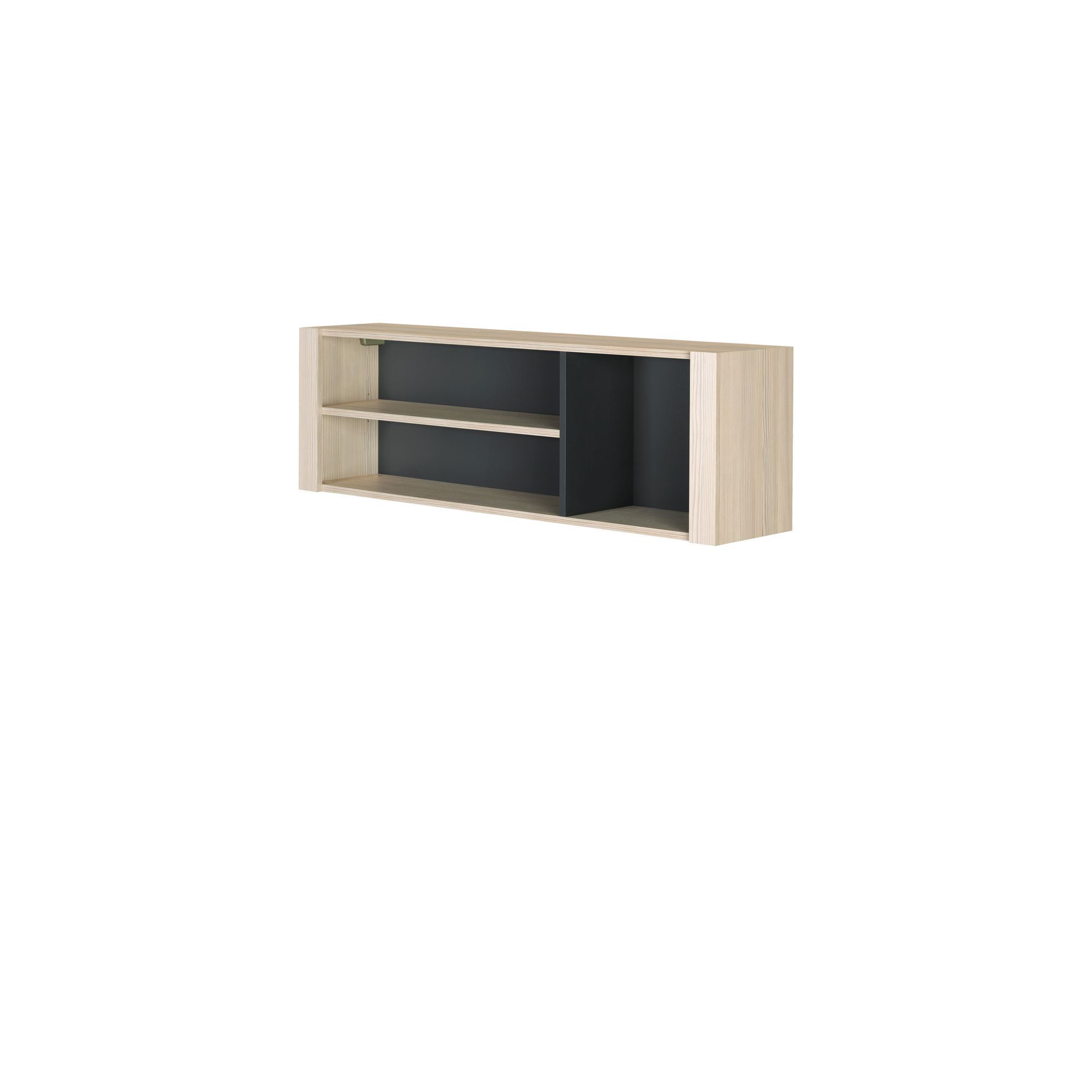 Wszędzie tam, gdzie potrzebujesz dodatkowego miejsca do przechowywania sprawdzą się meble, które możesz zawiesić na ścianie. Wiszący regał Monez pozwoli na uporządkowanie różnego rodzaju przedmiotów. Wykonany został z laminatu o naturalnej strukturze drewna, odpornego na zarysowania i uszkodzenia. Mebel tworzy wnęka z poziomą półką i pionową przegrodą. Korpus i półkę w wybarwieniu sosny avola połączono z tylną ścianką i przegrodą w kolorze grafitu. Takie połączenie, mimo kontrastu, tworzy neutralną całość, która dobrze będzie się czuła w towarzystwie wyrazistych dodatków.