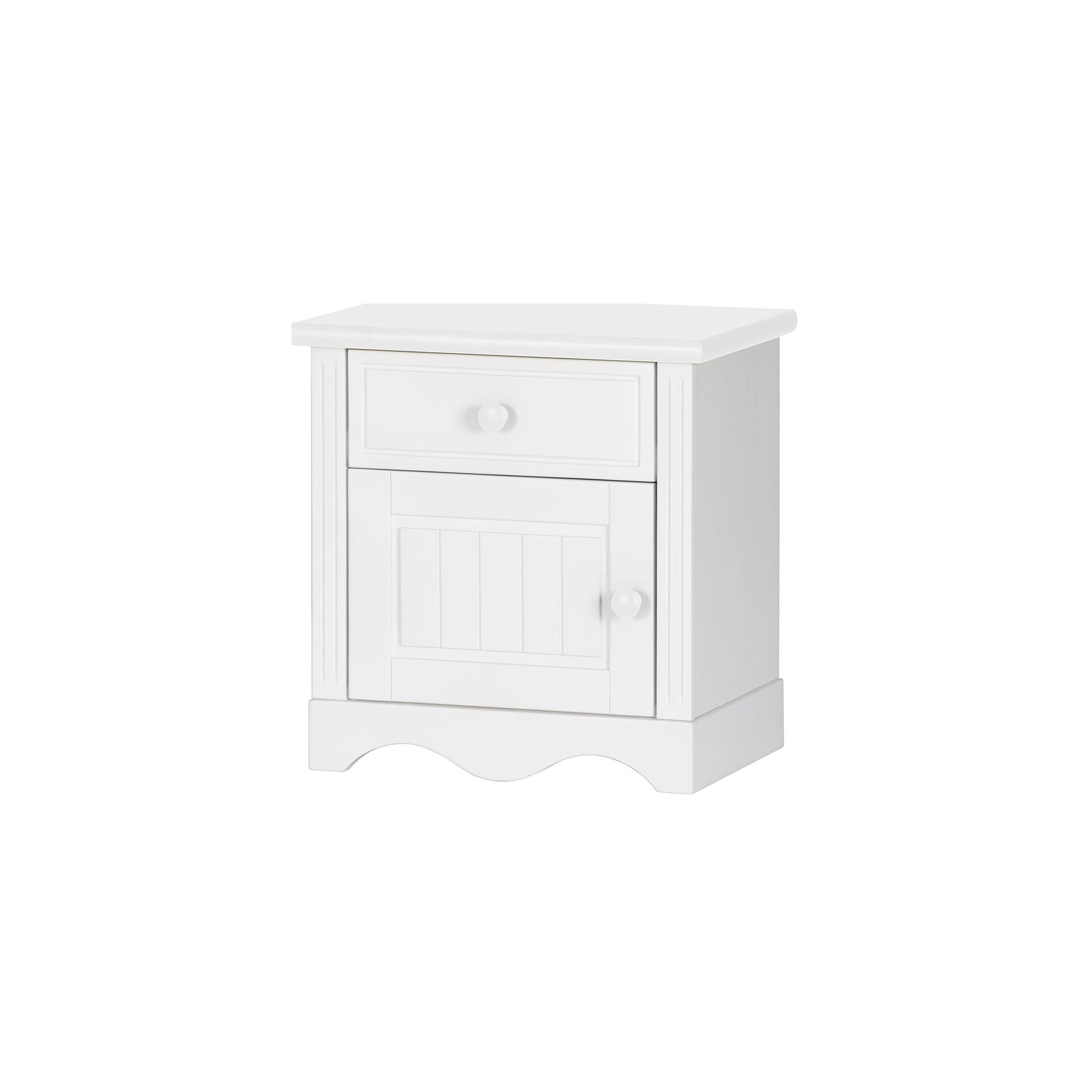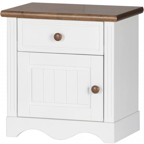 Oprócz wygodnego łóżka w pokoju dziecięcym sprawdzi się również praktyczna szafka nocna. Stolik z kolekcji Princessa to mebel niewielki, dzięki czemu zmieści się w pomieszczeniach o różnych rozmiarach. Mebel posiada ozdobny profilowany cokół, a subtelne przetłoczenia drzwiczek zostały zaczerpnięte ze stylistyki prowansalskiej. Zaoblone krawędzie blatu gwarantują bezpieczne użytkowanie. Szafka posiada szufladę i drzwiczki.