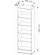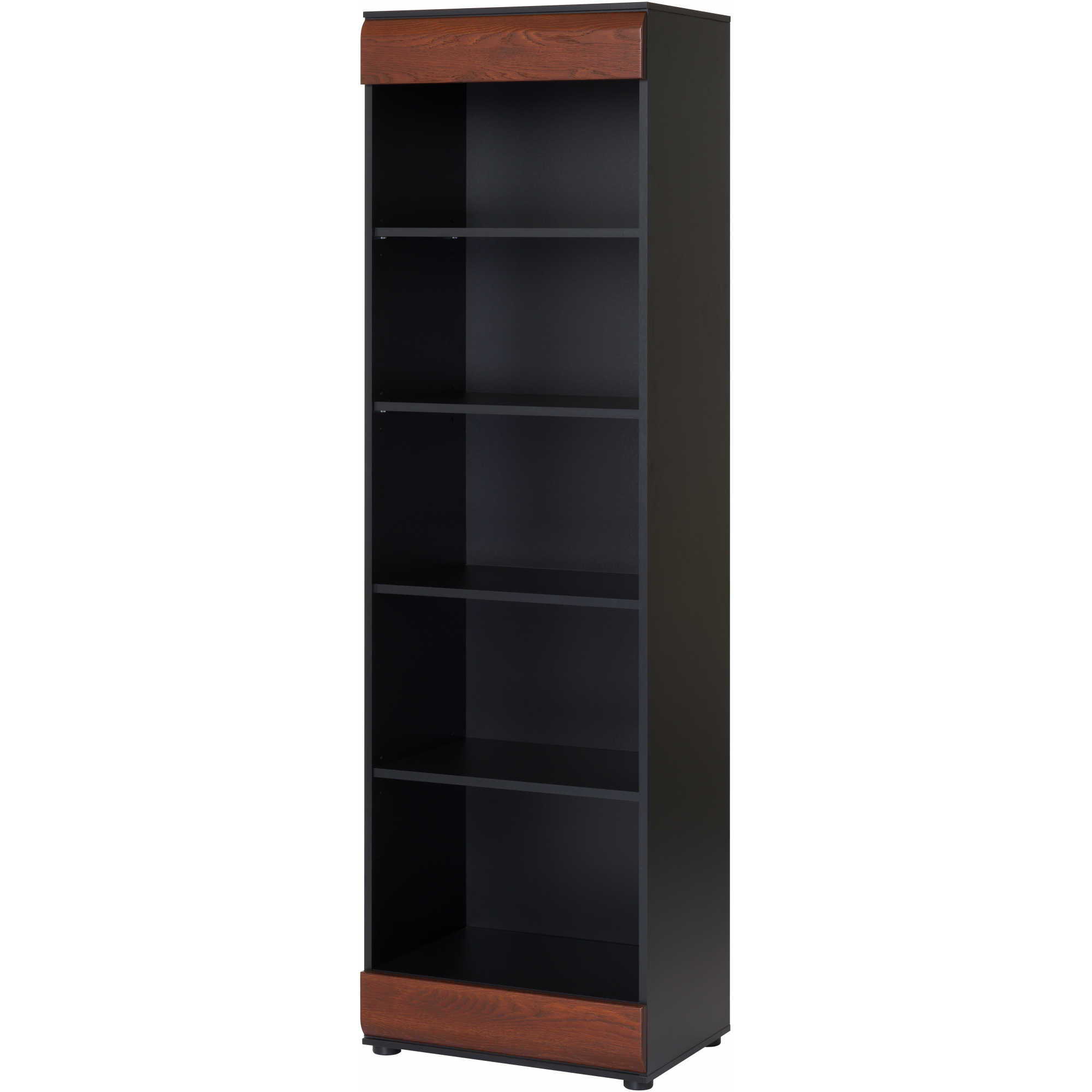 Otwarty regał to mebel, który sprawdzi się w wielu pomieszczeniach. W salonie utsawisz na nim dekoracje, w sypialni przechowasz książki i bibeloty, a w gabinecie przyda się do uporzadkowania dokumentów. Wysoki regał Vievien wyposażono w 5 pojemnych półek. Korpus mebla wykonano z laminowanej płyty meblowej w czarnym macie, a na jego dolnej i górnej krawędzi zamocowano ozdobne wstawki z dębowego drewna barwionego na koniak. Dzięki niedużej szerokości regał z powodzeniem zmieści się również w mniejszych pomieszczeniach.