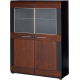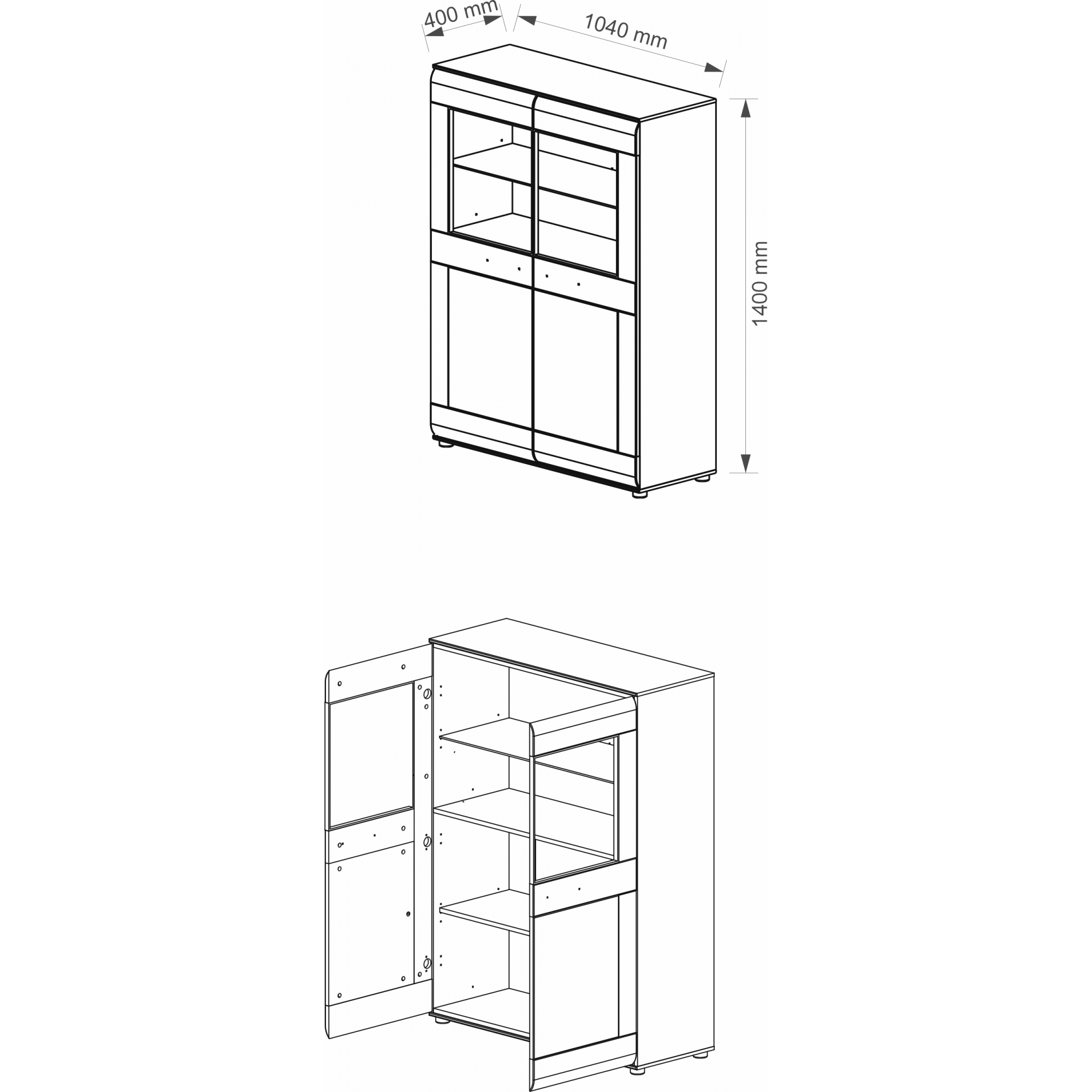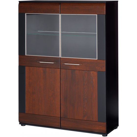 Duży kredens Vievien to mebel, z którym stworzysz elegancki salon. Sprawdzi się również w jadalni, gdzie pozwoli zyskać dodatkowe miejsce do przechowywania. Korpus mebla wykonany został z laminowanej płyty meblowej w czarnym macie. Front z litego dębowego drewna barwionego na koniak uzupełniono wstawkami z czarnego matowego szkła. Wyrazistą linię kredensu przełamują subtelne, podłużne uchwyty, aluminowa, połyskująca ramka z przeszkleniem oraz lekko zaoblone krawędzie drzwiczek. Wewnątrz znajdziesz jedną pełną i dwie szklane półki, które podkreślisz montując zestaw oświetleniowy LED dostępny w opcji dodatkowej.