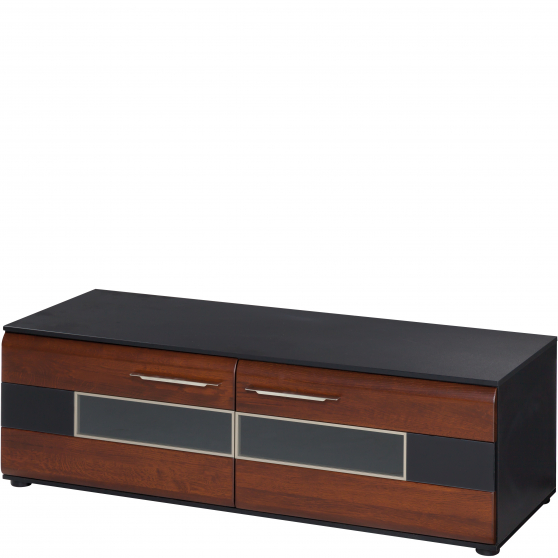 W salonie, czy też pokoju dziennym jednym z ważniejszych elementów jest praktyczna szafka telewizyjna. Mebel z kolekcji Vievien to prosta, ale elegancka konstrukcja. Czarny, matowy korpus szafki z laminowanej płyty meblowej łączy się z frontem z litego dębowego drewna barwionego na koniak. Wstawki z czarnego matowego szkła łączą się z niewielkim, bezbarwnym przeszkleniem dwóch przednich klap, osadzonym w błyszczącej, aluminiowej ramce. Wewnątrz znajdziesz dużo miejsca na przechowywanie akcesoriów RTV oraz innych drobiazgów.