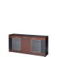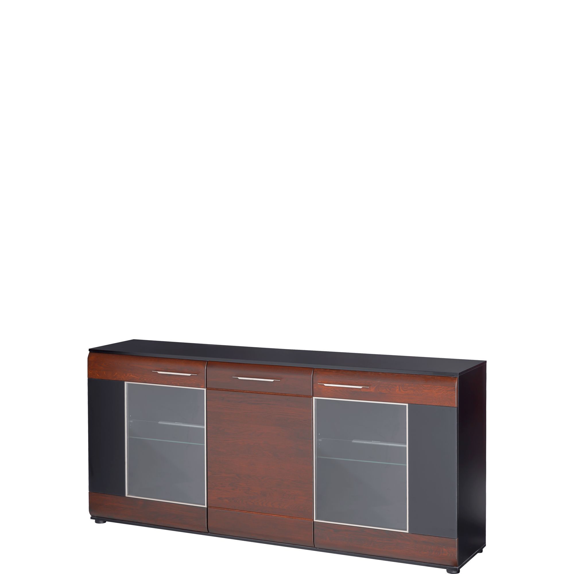 Duża komoda z kolekcji Vievien prezentuje się elegancko i odznacza oryginalną konstrukcją. Jej korpus został wykonany z laminowanej płyty meblowej z czarnym macie. Front natomiast to lite drewno dębowe barwione na koniak z wstawkami z czarnego matowego szkła. Boczne drzwiczki komody zostały przeszklone, a widoczne za nimi półki podkreślisz montując dostępne w opcji dodatkowej oświetlenie LED. Za środkowymi drzwiczkami znajdziesz jeszcze jedną półkę. Przeszklona komoda to doskonała propozycja do jadalni, jak i pokoju dziennego.
