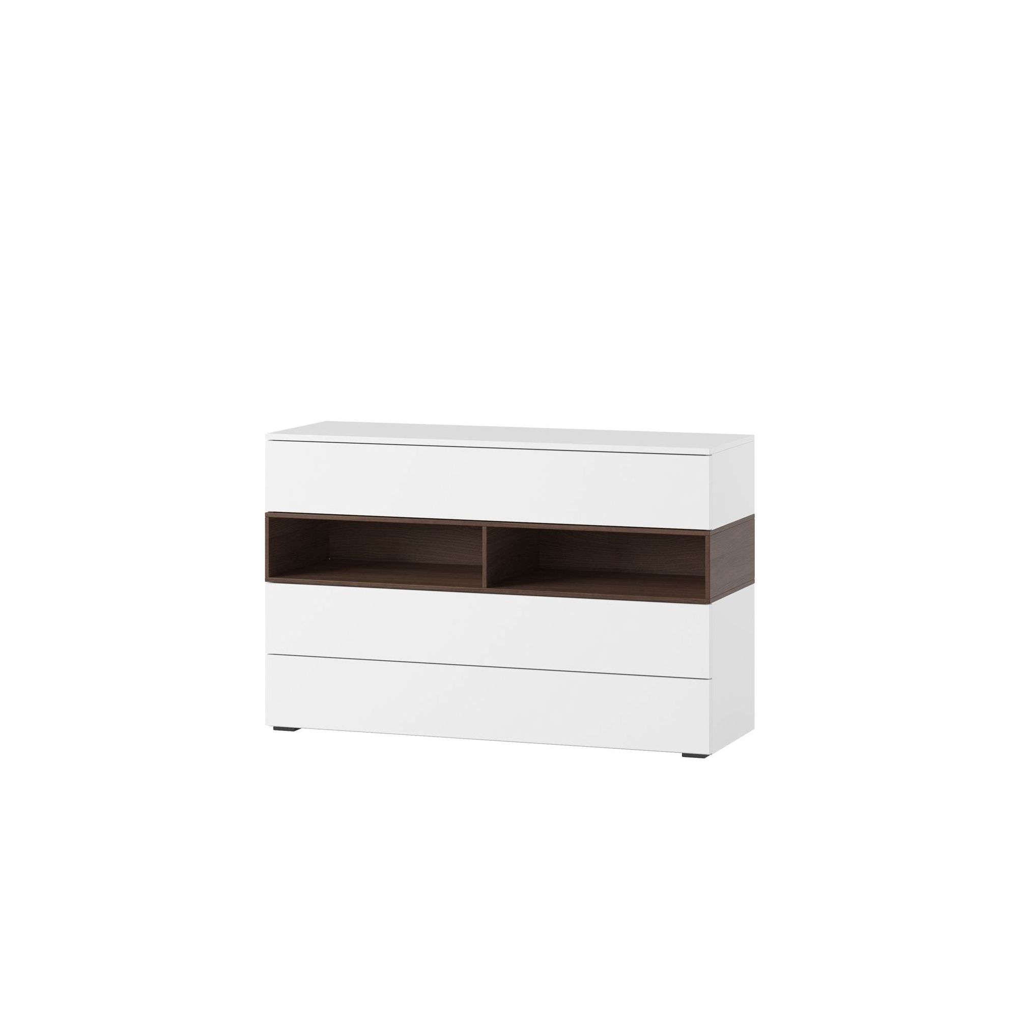 Niska komoda Loft to doskonałe uzupełnienie dla pozostałych modułów kolekcji. Wykonana została z laminowanej płyty meblowej w białym połysku, z wnęką w klimatycznym wybarwieniu wiśni malaga. Komoda posiada 3 szerokie, pojemne szuflady, w których pomieścisz wiele przedmiotów, oraz wnękę z przegrodą tworzącą dwie półki.