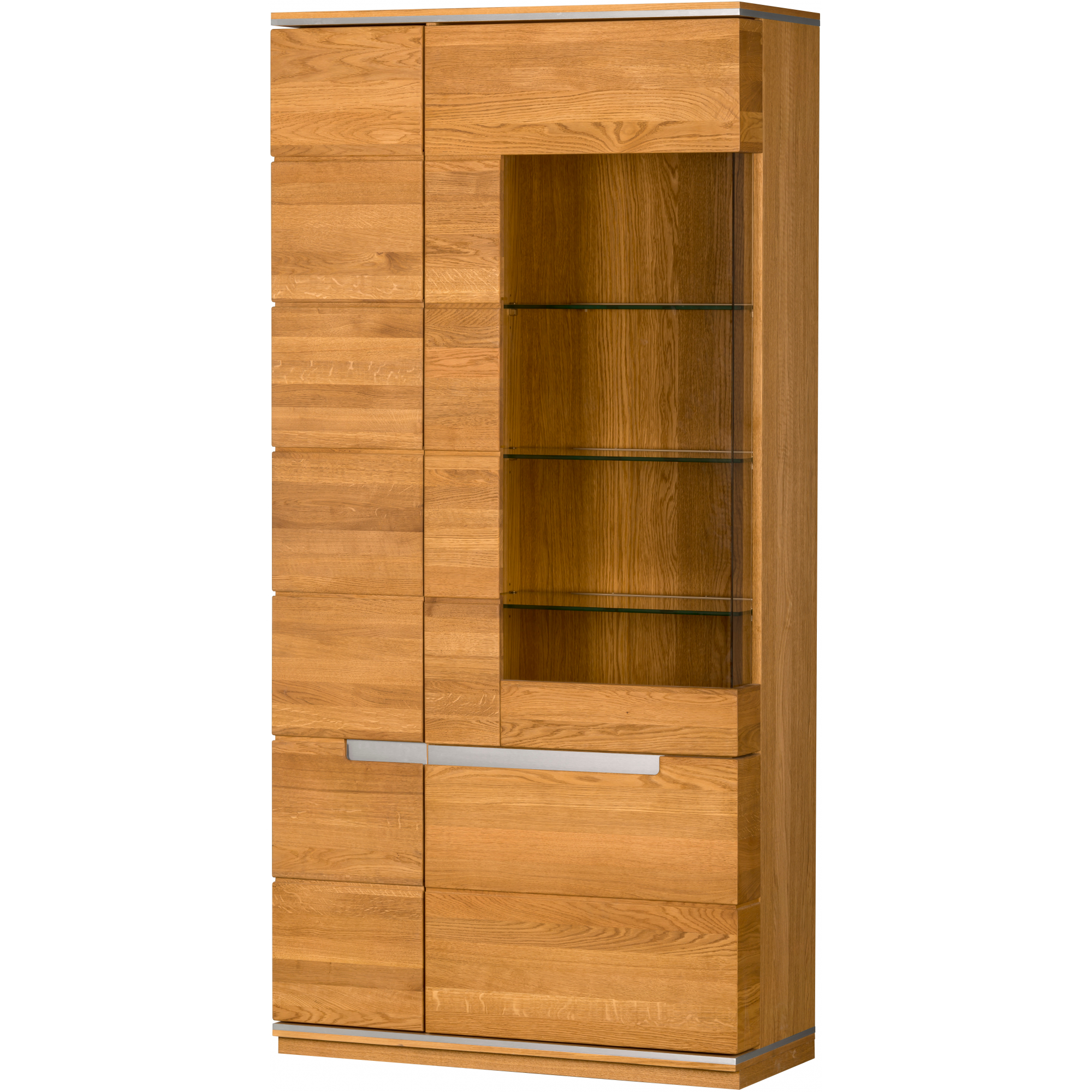 Dwudrzwiowa witryna Torino to idealne miejsce na wyeksponowanie Twoich ulubionych przedmiotów. Jej olejowana powierzchnia w kolorze złocistego dębu doskonale komponuje się z poziomymi frezowaniami zastępującymi uchwyty z wstawką ze stali szczotkowanej. Korpus wykonano z fornirowanej płyty meblowej, natomiast częściowo przeszklony front z litego drewna dębowego. Drzwiczki ze spowalniaczami gwarantują bezpieczne użytkowanie, a oświetlenie LED dostępne w opcji dodatkowej (za dopłatą) podkreśla wyjątkową linię mebla. Wewnątrz znajdziesz półki: 3 szklane i 7 pełnych.