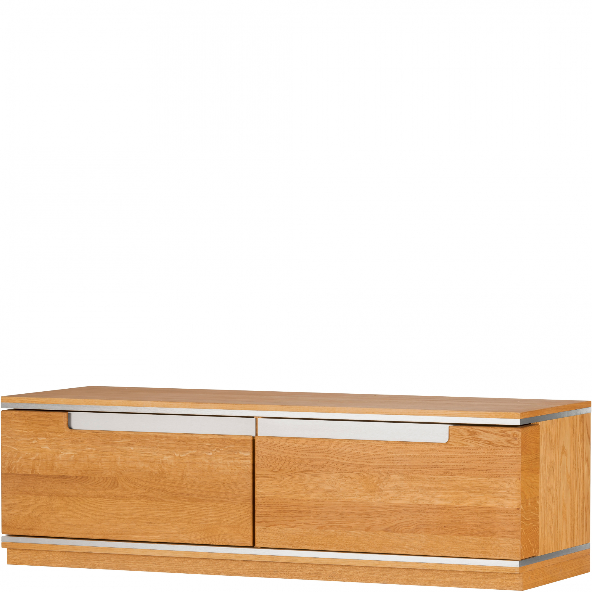 Niewielka szafka RTV z kolekcji Torino mimo swojej prostoty jest meblem niezwykle eleganckim. Wykonana na bazie fornirowanej płyty meblowej została wyposażona w drewniane drzwiczki. Całość olejowana, utrzymana w eleganckim wybarwieniu złocistego dębu. Tradycyjne uchwyty zastąpiono frezowaniami umieszczonymi w górnej części frontu. Nowoczesny charakter mebla podkreślają ozdobne wstawki ze stali szlachetnej. Szafka posiada 2 głębokie szuflady.