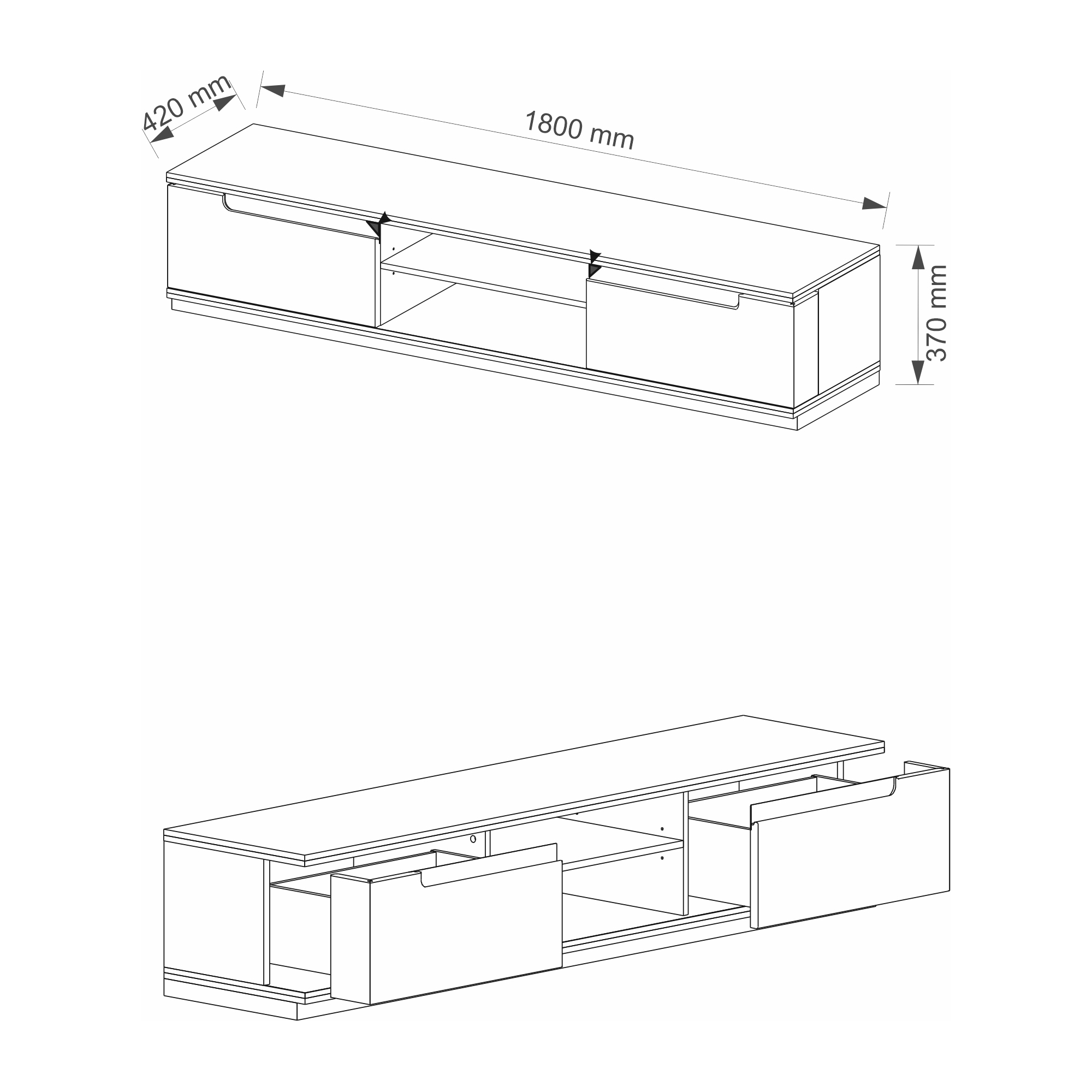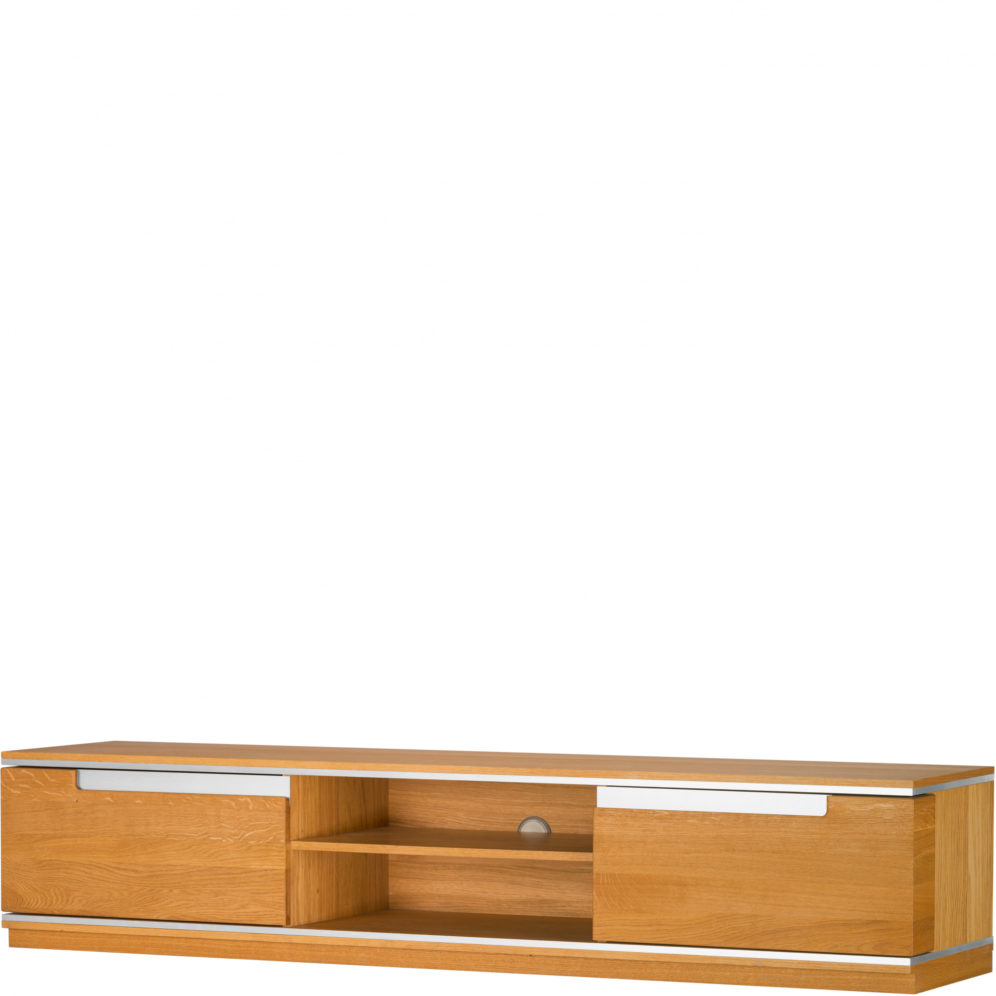 Szeroka szafka RTV Torino posiada dwie głębokie szuflady oraz umieszczoną na środku wnękę z półką. Korpus z płyty meblowej w okleinie naturalnej oraz front z litego drewna dębowego olejowane, w kolorze złocistego dębu. Frezowane uchwyty oraz wstawki ze szczotkowanej stali podkreślają wyjątkowy charakter mebla, będący stylowym połączeniem elegancji i nowoczesności. W tylnej ściance umieszczono wygodny otwór do odprowadzenia kabli.