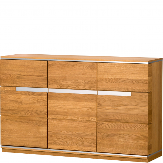 Komoda Torino to mebel elegancki, który sam w sobie stanowi doskonałą dekorację wnętrza. Fornirowane korpusy i dębowe fronty zostały poddane olejowaniu i uzupełnione frezowanymi uchwytami ze wstawką ze stali szlachetnej. Całość utrzymana w eleganckim wybarwieniu złocistego dębu sprawia, że z pozoru skromna, prosta bryła nabiera charakteru. W drzwiczkach i szufladach zastosowano spowalniacze, które gwarantują ciche i bezpieczne zamykanie. Komoda posiada 3 szuflady i 3 drzwiczek, za którymi znajdziesz 3 półki.