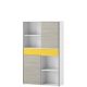 Szeroki, częściowo otwarty regał to mebel, który pozwoli na ergonomiczne zagospodarowanie przestrzeni w pokoju młodzieżowym. Regał został wykonany z laminowanej płyty meblowej w modnym zestawieniu kolorystycznym. Biały korpus połączono z bezuchwytowym frontem o wybarwieniu dębu latte i soczystej żółci. Mebel podzielono na dwie strefy przedzielone szeroką szufladą – w każdej z nich umieszczono wnękę z półką i drzwiczki, za którymi ukryta jest jeszcze jedna półka. System dotykowego otwierania push-to-open gwarantuje wygodne użytkowania.