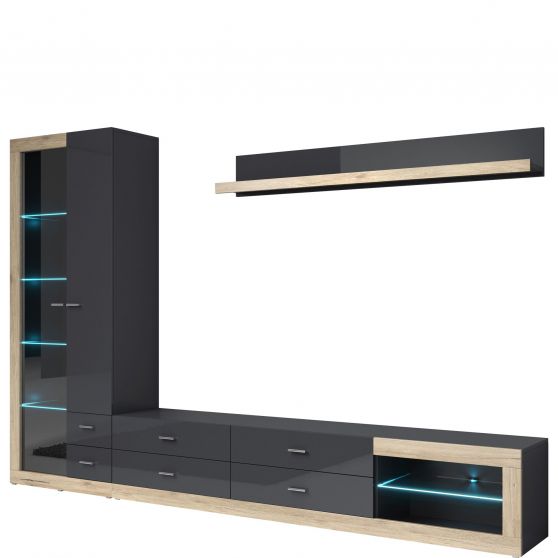 Meblościanka to gotowa aranżacja pokoju dziennego. Zestaw Tessa to nowoczesne meble w modnym zestawieniu kolorystycznym - pogrubioną ozdobną ramkę w naturalnym wybarwieniu jasnego dębu san remo połączono z frontami i korpusami w klimatycznym kolorze antracytu. Całość doskonale uzupełniają niewielkie srebrne uchwyty oraz półki z możliwością zamontowania oświetlenia LED.