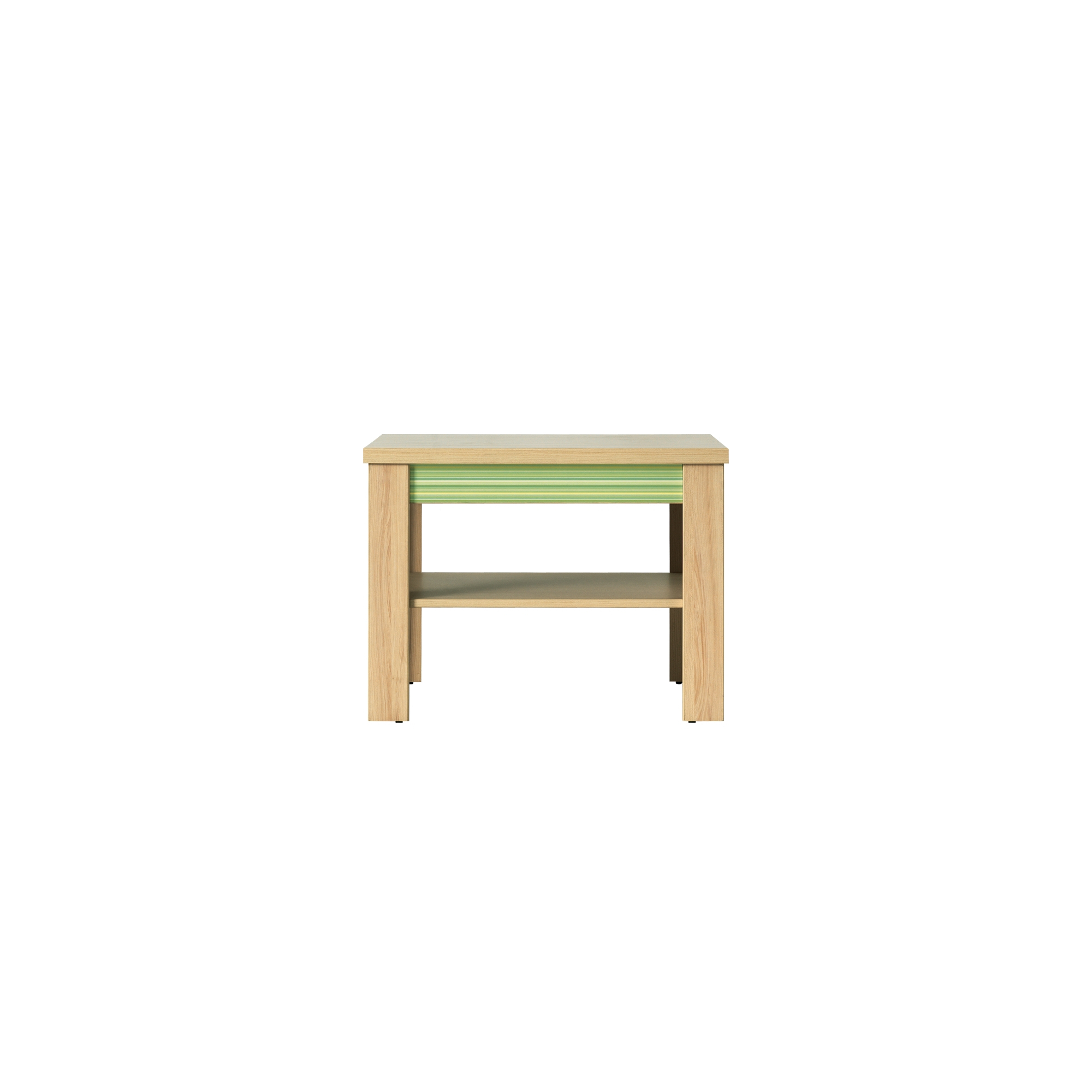 Mała ława z kolekcji Codi to propozycja do pokoju nastolatka. Mebel utrzymany w przyjemnej, jasnej kolorystyce wiśni cornvall z wstawkami w dekorze Rainbow Green. Ława została wykonana z odpornej na uszkodzenia laminowanej płyty meblowej, oraz wyposażona w funkcjonalną półkę umieszczoną pod blatem – idealne miejsce na książki, czasopisma i inne drobiazgi, których nie brakuje w pokoju młodzieżowym.