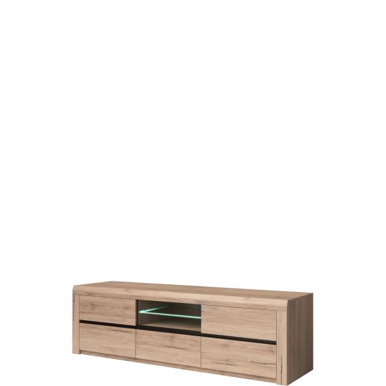 Szeroka szafka RTV Marseille posiada charakterystyczny dla całego programu, pogrubiony korpus, który w połączeniu z naturalnym kolorem drewna daje nieco skandynawskie połączenie. Wybarwienie jasnego dębu san remo podkreślają czarne elementy i szklana otwarta półka, która nadaje dość masywnej bryle lekkości. Szafka posiada 5 szuflad z kulkowymi prowadnicami. Tradycyjne uchwyty zastąpiło frezowanie. Mebel wykonany z laminowanej płyty. Oświetlenie LED dla szklanej półki w opcji dodatkowej.