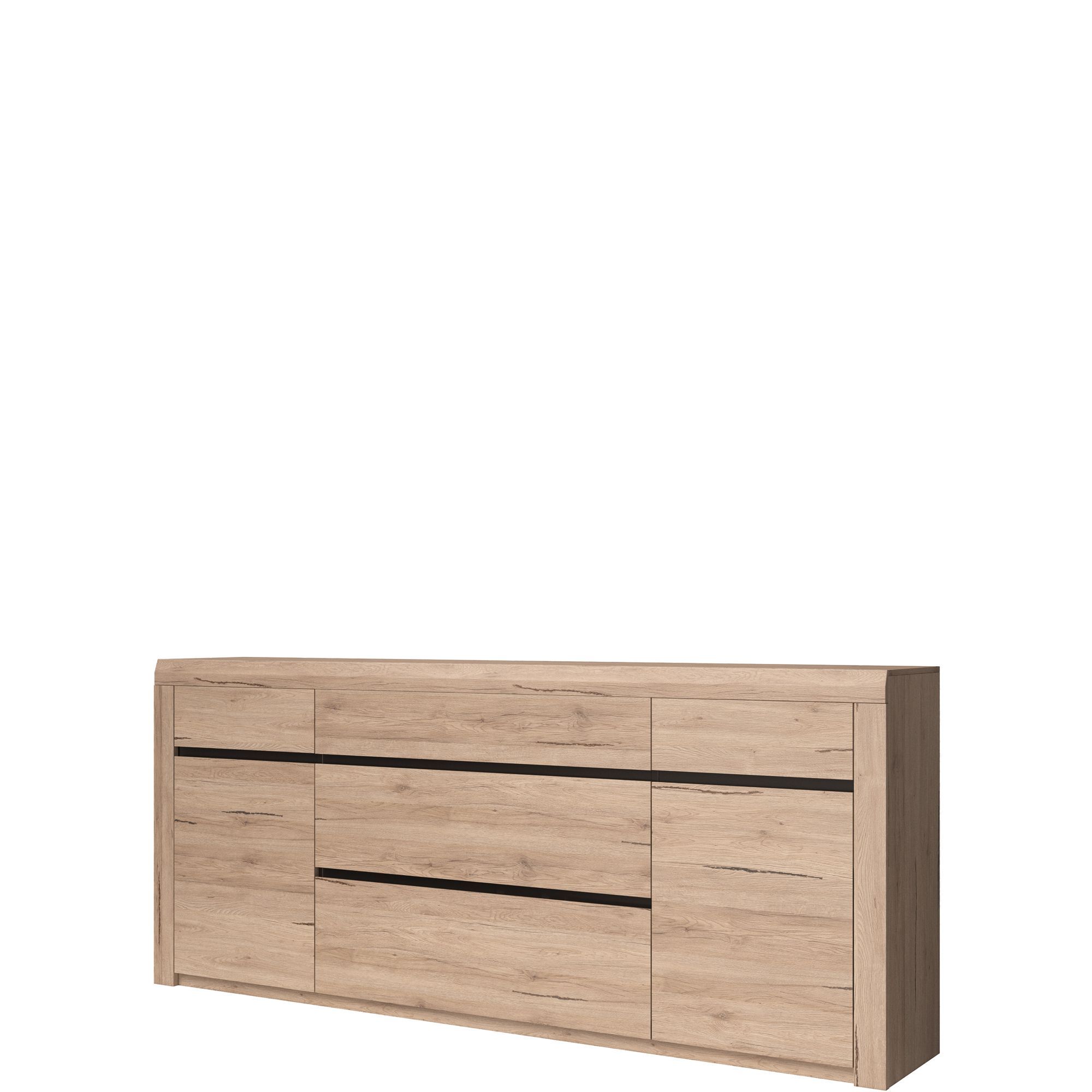 Szeroka komoda Marseille to mebel, który sprawdzi się w pokoju dziennym. Jest nie tylko funkcjonalna, ale również elegancka. Inspirowana stylem skandynawskim została wykonana z laminatu w kolorze jasny dąb san remo z czarnymi wstawkami. Jej wyjątkowy charakter podkreśla pogrubiony korpus oraz frezowania zastępujące tradycyjne uchwyty. Komoda posiada 5 szuflad i 2 drzwi.