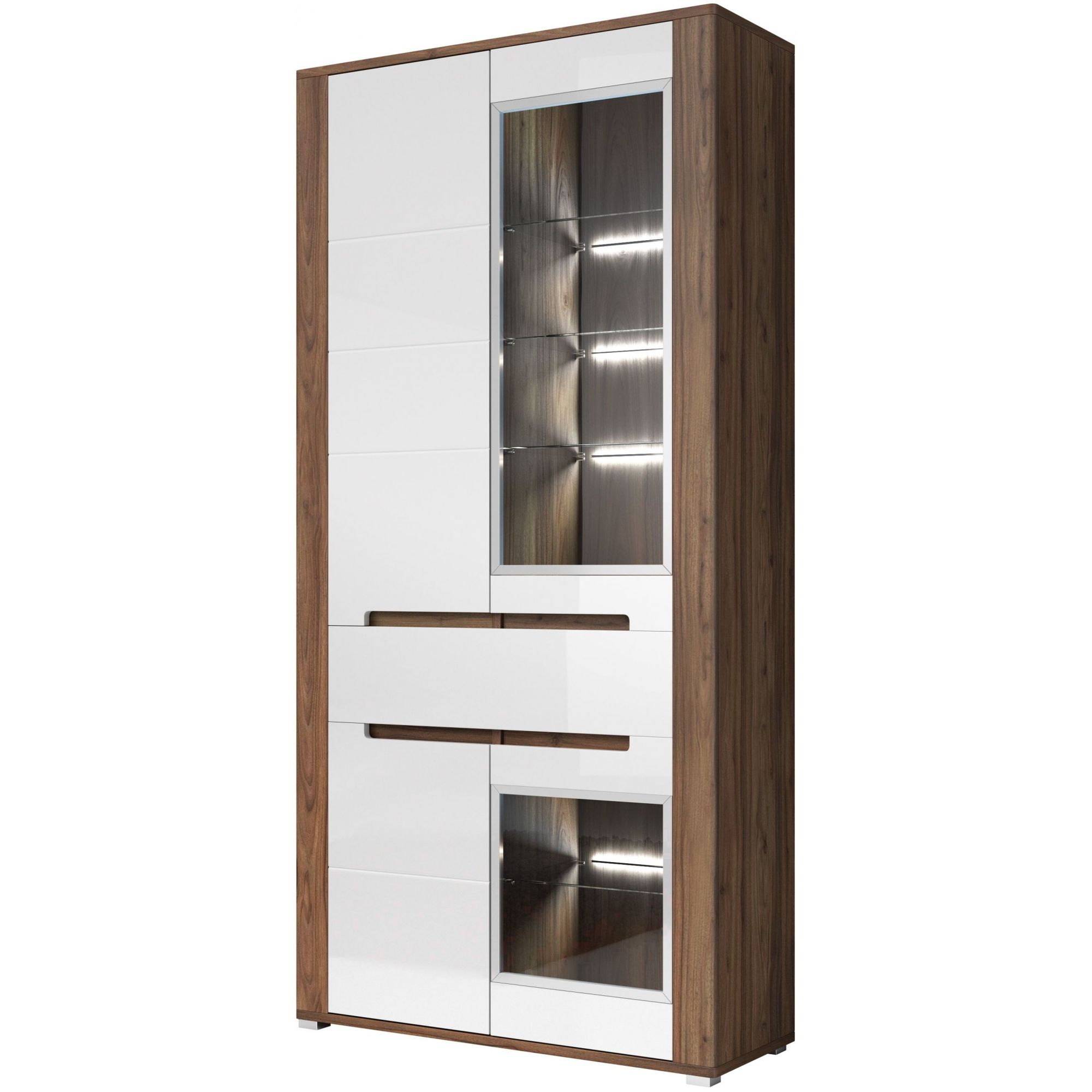 Wysoka witryna Neapoli to mebel, który w wyjątkowy sposób wyeksponuje Twoje ulubione przedmioty. Wykonana z laminatu w kolorze orzech canyon mountain została wyposażona w lśniąco biały front z przeszkleniem. Tradycyjne uchwyty zastąpiono frezowaniami, a subtelne przetłoczenia frontu dają warzenie jego segmentowej budowy. Witryna posiada szeroką szufladę i czworo drzwiczek. Wewnątrz półki. Oświetlenie LED w komplecie.
