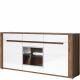 Szeroka komoda Neapoli to mebel, który sprawdzi się w pokoju dziennym lub jadalni. Jest nie tylko funkcjonalna, ale również elegancka. Wykonana z laminatu w wybarwieniu orzech canyon mountain z foliowanym frontem w białym połysku. Jej wyjątkowy charakter podkreślają delikatne poziome przetłoczenia drzwiczek sprawiające wrażenie ich segmentowej budowy. Komoda posiada 3 drzwiczek i 3 szuflady. Oświetlenie LED w komplecie.