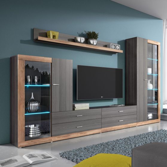 Meblościanka to gotowa aranżacja pokoju dziennego. Zestaw Tessa to nowoczesne meble w modnym zestawieniu kolorystycznym - pogrubioną ozdobną ramkę w naturalnym wybarwieniu satynowego orzecha połączono z frontami i korpusami w klimatycznym kolorze touchwood. Całość doskonale uzupełniają niewielkie srebrne uchwyty oraz półki z możliwością zamontowania oświetlenia LED.