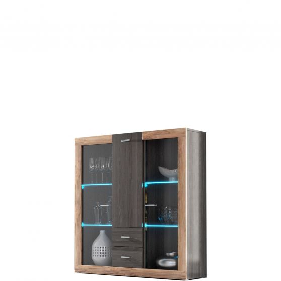 Wysoka komoda Tessa to uzupełnienie dla meblościanki dostępnej w ramach tego samego programu. Komoda posiada korpus i front w klimatycznym kolorze touchwood, połączony z ozdobną ramką w naturalnym wybarwieniu drewna orzech satynowy. W środkowej części mebla umieszczono podłużne drzwiczki i dwie szuflady. Boczne drzwi zostały przeszklone, co stworzyło doskonałe miejsce do wyeksponowania dekoracji. Oświetlenie LED dostępne w opcji dodatkowej.
