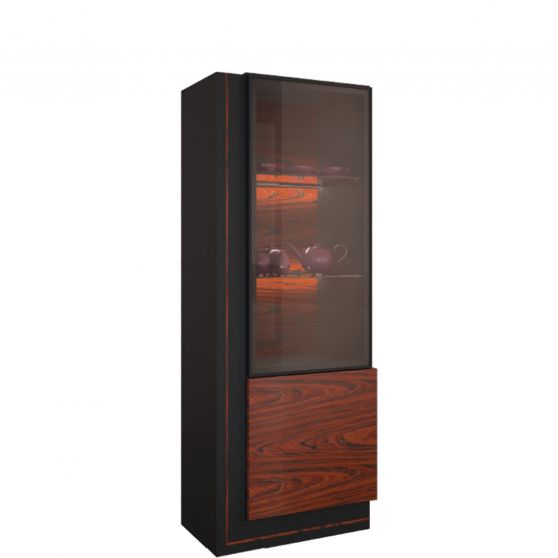 Pojedyncza witryna z kolekcji Elegante może być podstawą dla aranżacji Twojego salonu lub pokoju dziennego, nawet jeśli wnętrza nie charakteryzuje duży metraż. Prosta forma mebla w zestawieniu z kontrastową kolorystyką tworzy idealny duet. Matowy, ciemny korpus stanowi doskonałe tło dla frontu w wybarwieniu palisander Rio lub orzech amerykański, z wyraźnym naturalnym wzorem usłojenia drewna. Całość została wykonana z wysokogatunkowej, odpornej na uszkodzenia meblowej płyty w okleinie naturalnej. Wygodny system otwierania dotykowego gwarantuje bezpieczne i komfortowe użytkowanie, a nowoczesne sensorowe oświetlenie LED pozwoli w wyjątkowy sposób wyeksponować ulubione przedmioty. Witryna posiada jedne drzwi ze szkłem i jedne pełne. Wewnątrz znajdziesz pojemne półki. Klasyczne wybarwienie nawiązuje do mebli sprzed kilku dekad, lecz połączenie z eleganckim antracytem sprawia, że witryna Elegante znakomicie wpisuje się w nowoczesną stylistykę.