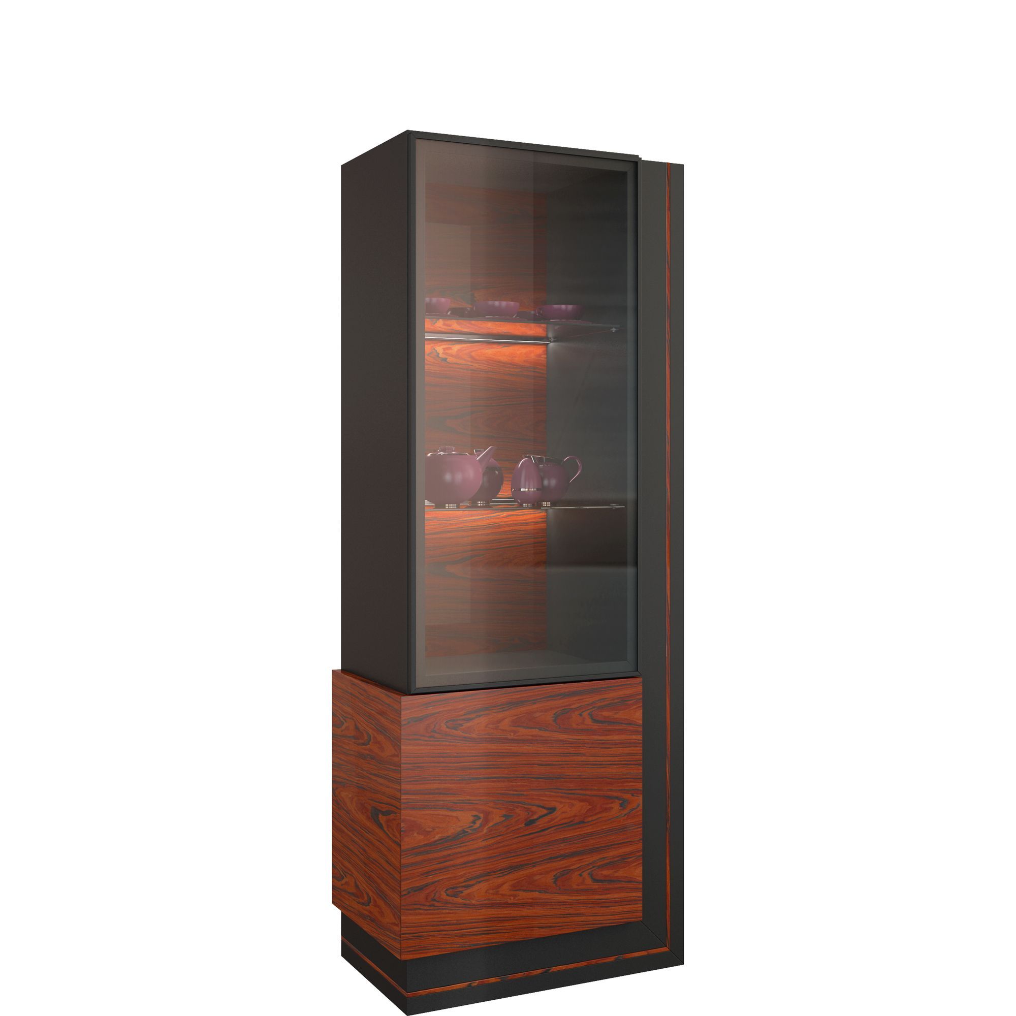 Pojedyncza witryna z kolekcji Elegante może być podstawą dla aranżacji Twojego salonu lub pokoju dziennego, nawet jeśli wnętrza nie charakteryzuje duży metraż. Prosta forma mebla w zestawieniu z kontrastową kolorystyką tworzy idealny duet. Matowy, ciemny korpus stanowi doskonałe tło dla frontu w wybarwieniu palisander Rio lub orzech amerykański, z wyraźnym naturalnym wzorem usłojenia drewna. Całość została wykonana z wysokogatunkowej, odpornej na uszkodzenia meblowej płyty w okleinie naturalnej. Wygodny system otwierania dotykowego gwarantuje bezpieczne i komfortowe użytkowanie, a nowoczesne sensorowe oświetlenie LED pozwoli w wyjątkowy sposób wyeksponować ulubione przedmioty. Witryna posiada jedne drzwi ze szkłem i jedne pełne. Wewnątrz znajdziesz pojemne półki. Klasyczne wybarwienie nawiązuje do mebli sprzed kilku dekad, lecz połączenie z eleganckim antracytem sprawia, że witryna Elegante znakomicie wpisuje się w nowoczesną stylistykę.