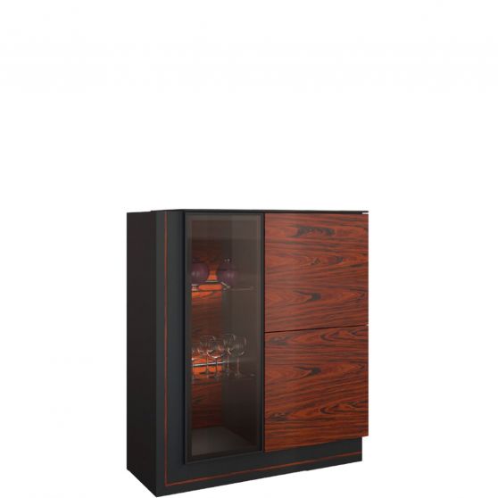 Barki kojarzą się nam z nieciekawymi meblami, jakie znamy sprzed kilkunastu lat. Nowoczesne barki wciąż pełnią tę samą funkcję, co ich poprzednicy, prezentują się jednak dużo bardziej atrakcyjnie. Model z kolekcji Elegante to kwintesencja stylu i elegancji. Wykonany w okleinie naturalnej, powstał z połączenia powierzchni w dwóch wyrazistych kolorach, które doskonale do siebie pasują. Matowy, antracytowy korpus stanowi świetną bazę dla frontu w naturalnym kolorze drewna: palisander Rio lub orzech amerykański – obydwa bardzo intrygujące i klimatyczne. Barek posiada boczne, szklone drzwiczki z oświetleniem LED znajdujących się za nimi półek (włącznik sensorowy). Druga część składa się z dwojga pełnych drzwiczek. Wewnątrz praktyczne, pojemne półki.