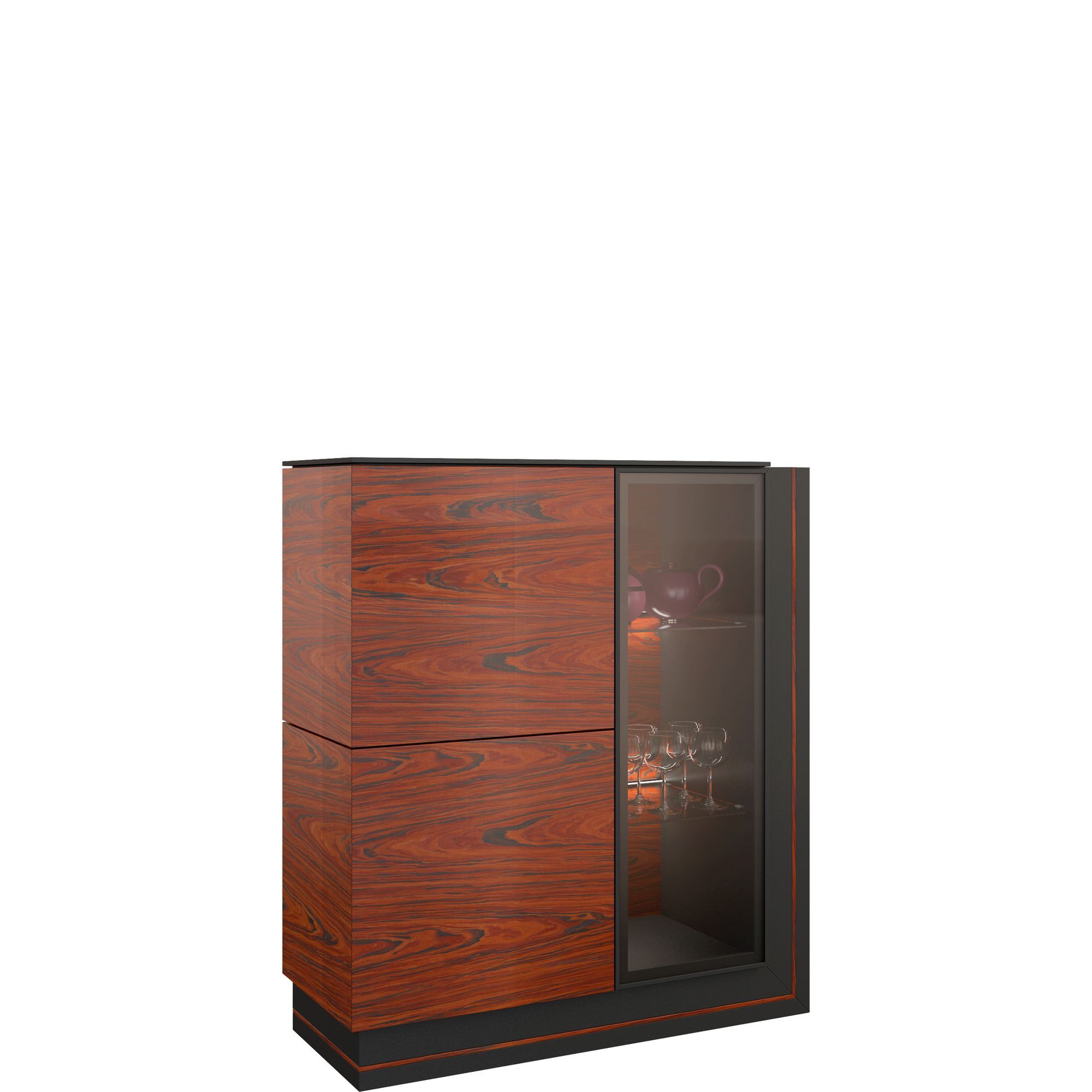 Barki kojarzą się nam z nieciekawymi meblami, jakie znamy sprzed kilkunastu lat. Nowoczesne barki wciąż pełnią tę samą funkcję, co ich poprzednicy, prezentują się jednak dużo bardziej atrakcyjnie. Model z kolekcji Elegante to kwintesencja stylu i elegancji. Wykonany w okleinie naturalnej, powstał z połączenia powierzchni w dwóch wyrazistych kolorach, które doskonale do siebie pasują. Matowy, antracytowy korpus stanowi świetną bazę dla frontu w naturalnym kolorze drewna: palisander Rio lub orzech amerykański – obydwa bardzo intrygujące i klimatyczne. Barek posiada boczne, szklone drzwiczki z oświetleniem LED znajdujących się za nimi półek (włącznik sensorowy). Druga część składa się z dwojga pełnych drzwiczek. Wewnątrz praktyczne, pojemne półki.