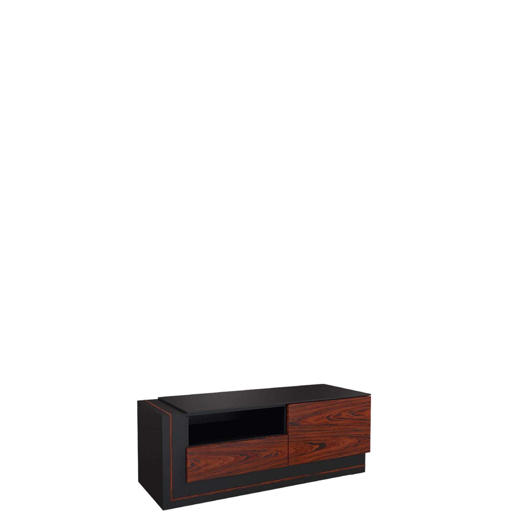 W aranżacji przestrzeni telewizyjnej powinny znaleźć się meble funkcjonalne. Mała szafka RTV z kolekcji Elegante charakteryzuje się prostotą wykonania oraz oryginalnym zestawieniem kolorystycznym. Niski mebel został wykonany w okleinie naturalnej – antracytowy, ciemny korpus połączono z drzwiczkami w naturalnym kolorze drewna: palisander Rio lub orzech amerykański. Szafka posiada jedną szufladę oraz drzwiczki z wygodnym mechanizmem otwierania dotykowego. Wewnątrz znajdziesz jedną lakierowaną półkę. Nad szufladą umieszczono wnękę tworzącą półkę – miejsce na ustawienie odtwarzacza lub innego sprzętu RTV. Dzięki swoim rozmiarom mebel sprawdzi się również w niewielkich pomieszczeniach.