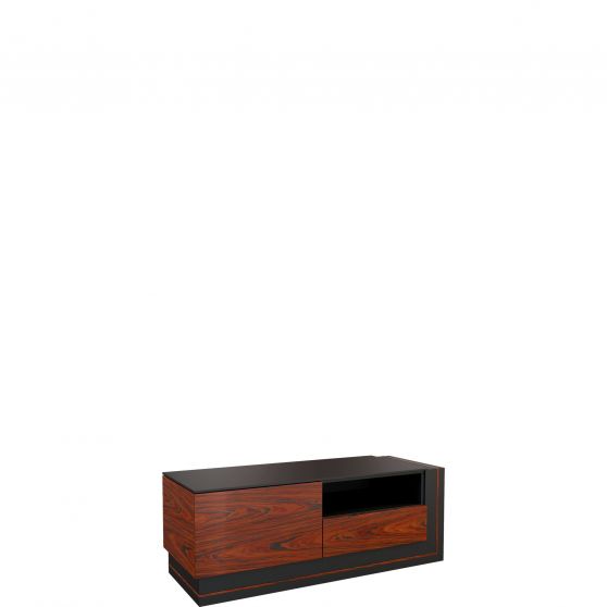 W aranżacji przestrzeni telewizyjnej powinny znaleźć się meble funkcjonalne. Mała szafka RTV z kolekcji Elegante charakteryzuje się prostotą wykonania oraz oryginalnym zestawieniem kolorystycznym. Niski mebel został wykonany w okleinie naturalnej – antracytowy, ciemny korpus połączono z drzwiczkami w naturalnym kolorze drewna: palisander Rio lub orzech amerykański. Szafka posiada jedną szufladę oraz drzwiczki z wygodnym mechanizmem otwierania dotykowego. Wewnątrz znajdziesz jedną lakierowaną półkę. Nad szufladą umieszczono wnękę tworzącą półkę – miejsce na ustawienie odtwarzacza lub innego sprzętu RTV. Dzięki swoim rozmiarom mebel sprawdzi się również w niewielkich pomieszczeniach.