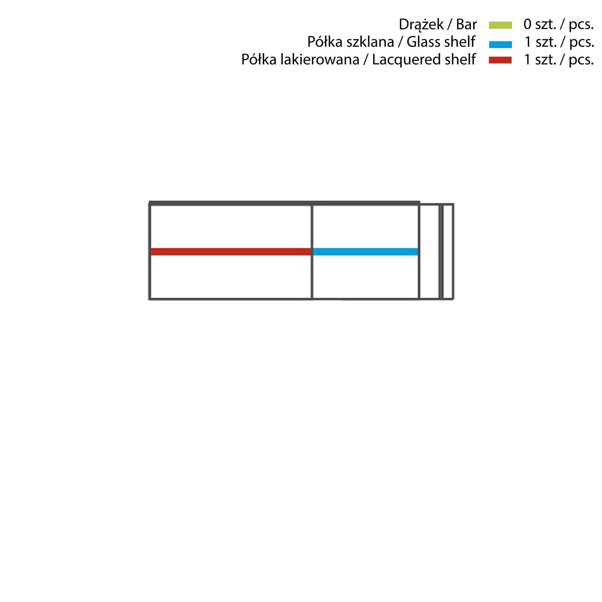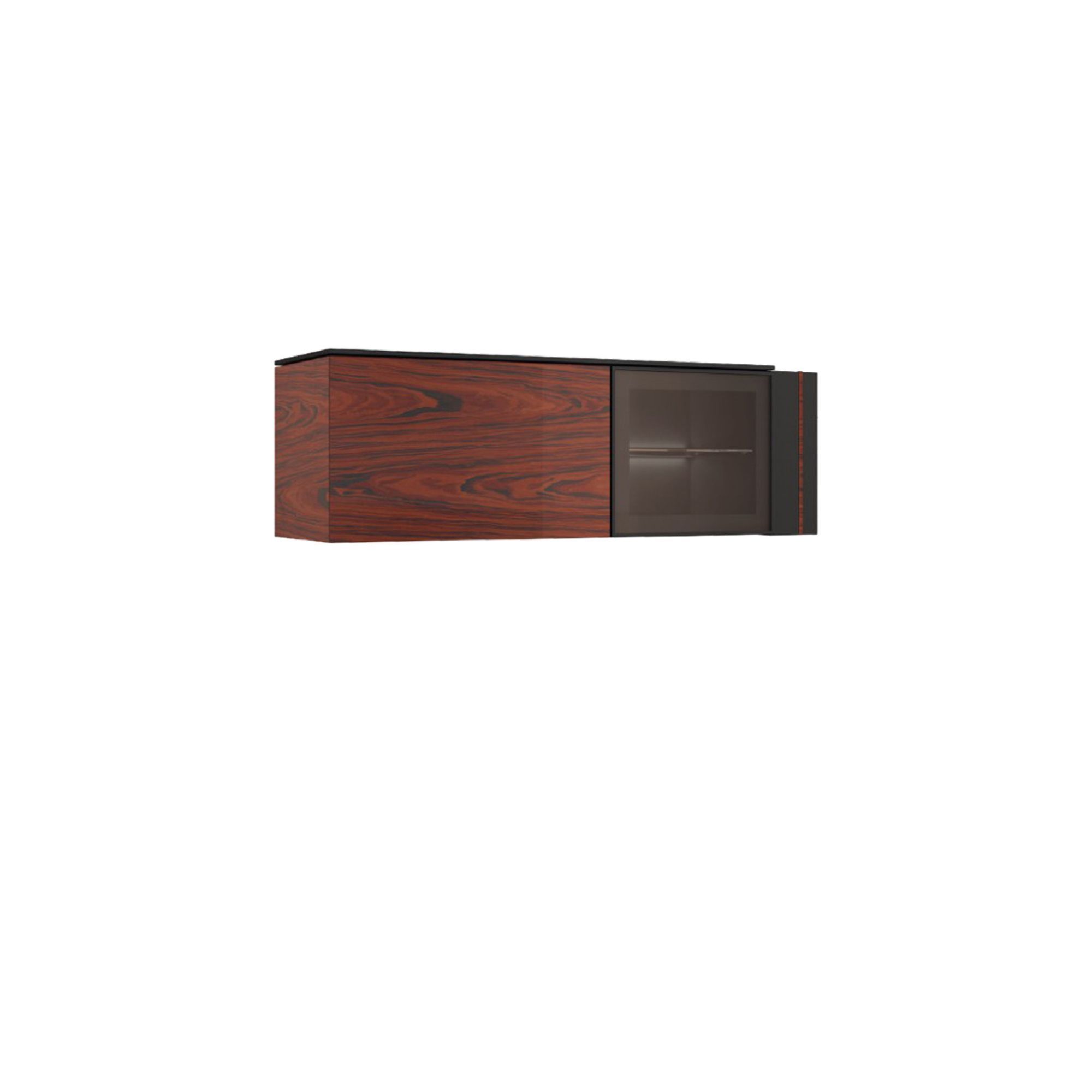 Wisząca witrynka z kolekcji Elegante to mebel niewielki, ale stylowy. Prostą konstrukcję przełamuje odważne połączenie dwóch wyrazistych, ale doskonale uzupełniających się kolorów. Ciemny, antracytowy korpus stał się idealną bazą dla drzwiczek w intensywnym wybarwieniu naturalnego drewna: palisandru Rio lub orzecha amerykańskiego. Wyraźny rysunek usłojenia drewna jeszcze bardziej podkreśla wyjątkowy charakter mebla. Nie bez znaczenia jest również zestawienie ze sobą różnego rodzaju powierzchni. Korpus i pełne drzwiczki w okleinie naturalnej uzupełniono przeszklonym frontem. Widoczne wnętrze witryny podkreśla dyskretne, sensorowe oświetlenie LED dostępne w standardowym wyposażeniu. Wewnątrz znajdziesz jedną szklaną i jedną pełną półkę.