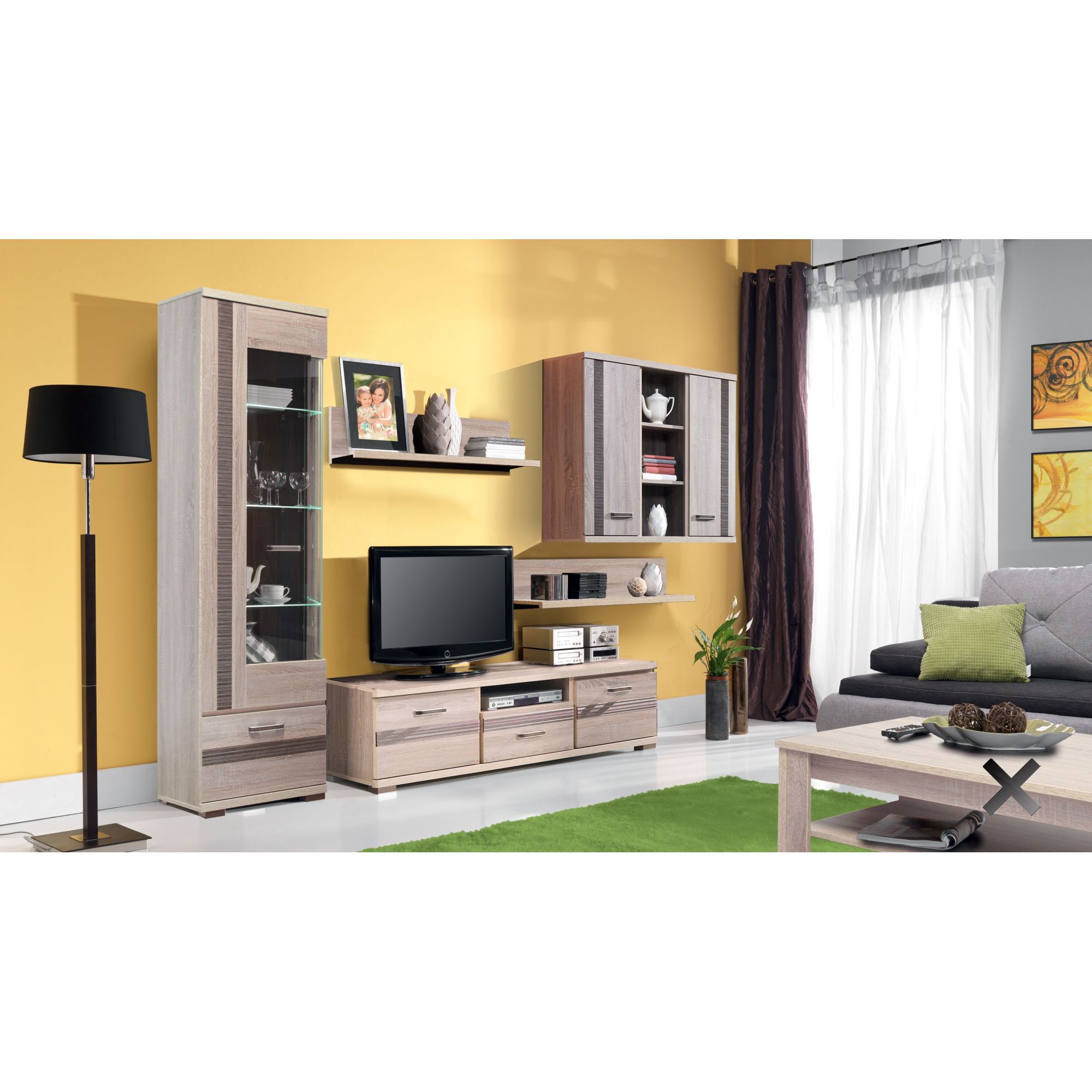 Zestaw mebli Orest do pokoju dziennego dzięki któremu stworzysz stylową aranżację. Bryły wykonane z laminowanej płyty meblowej utrzymanej w jasnym, przyjemnym wybarwieniu dąb sonoma truflowy. Ozdobne, ryflowane wstawki frontów wykonane z płyty MDF oklejonej folią PCV w kolorze dąb sonoma ciemny.