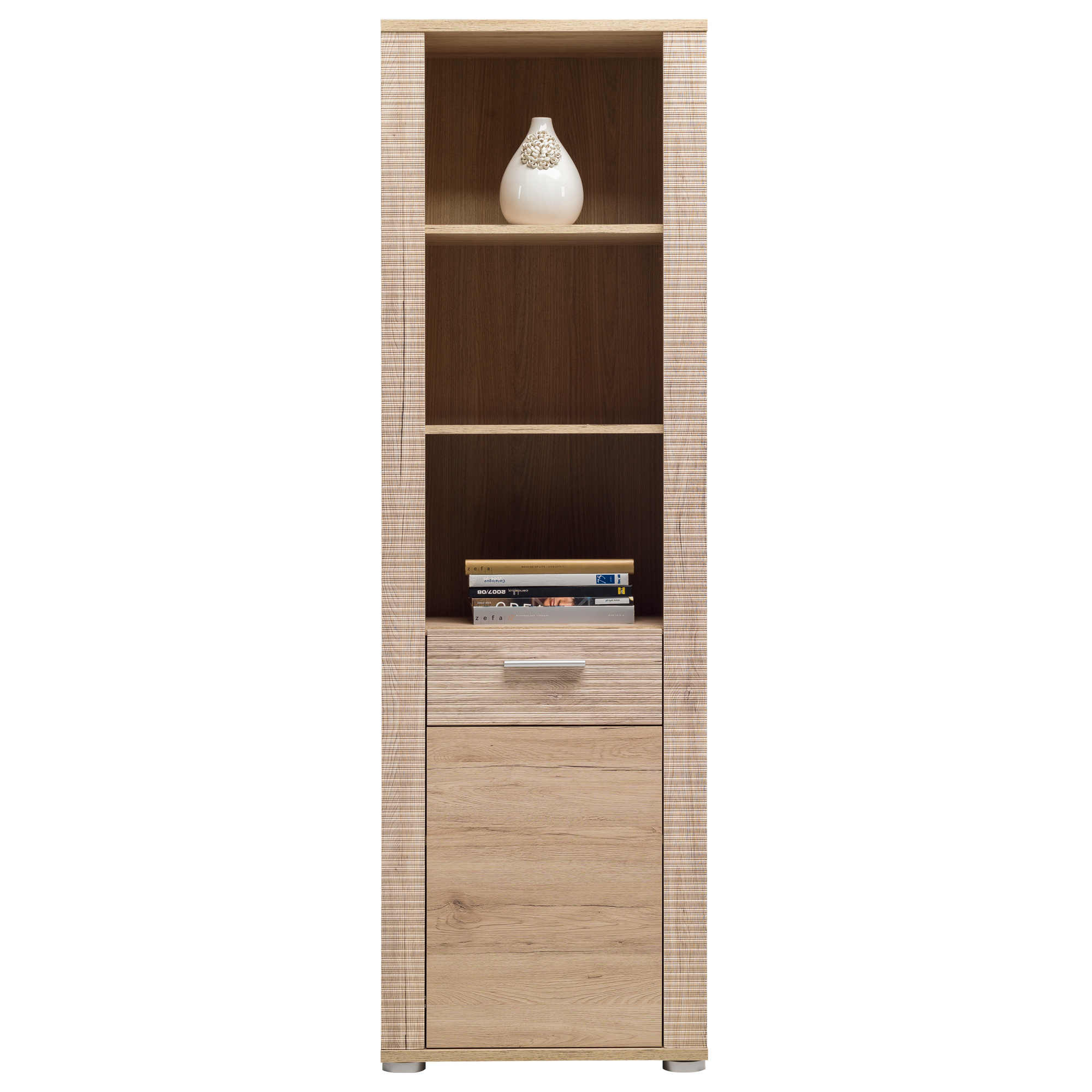 Częściowo otwarty regał z systemu mebli Nicol. W górnej części mebla znajduje się wnęka z dwoma półkami, a w dolnej drzwiczki, które możesz zamontować zgodnie ze swoimi preferencjami - po prawej lub lewej stronie. Listwy strukturalne umieszczone po bokach frontu oraz ryflowana wstawka, na której zamontowano uchwyt sprawiają, że mebel prezentuje się niezwykle atrakcyjnie. Świetny sposób na uporządkowanie książek, pamiątek czy innych bibelotów. Prosta konstrukcja dodaje mu klasy i stylu, dlatego wpasuje się zarówno w wystrój eleganckiego salonu, jak i przytulnej sypialni.