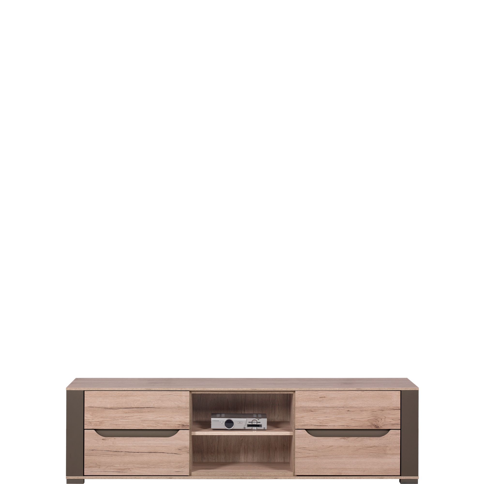 Duża szafka RTV z kolekcji Sven utrzymana w przyjemnym, jasnym wybarwieniu dąb sanremo przełamanym kontrastowymi listwami MDF w kolorze latte, które nadają jej nowoczesnego charakteru. Po bokach mebla umieszczono drzwiczki z wygodnymi frezowaniami zamiast uchwytów, a na środku wnękę z półką przystosowaną do przechowywania sprzętu elektronicznego lub odtwarzacza. Z tyłu szafki znajdziesz dwa wygodne otwory do odprowadzenia kabli.