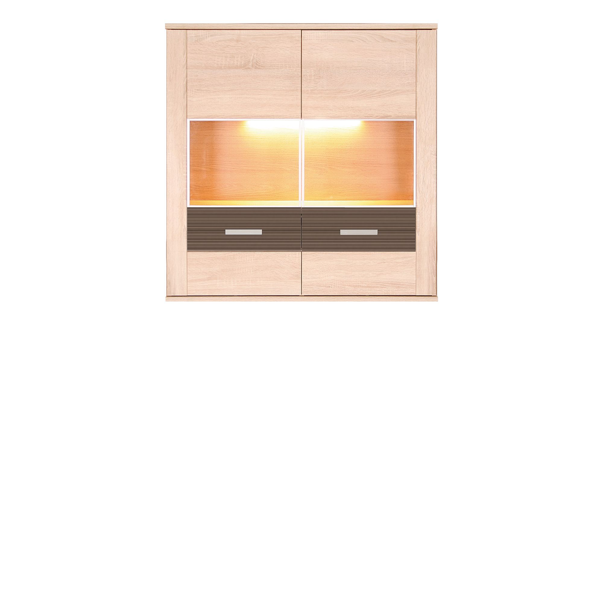 Efektownym uzupełnieniem umeblowania salonu jest wisząca witryna. Ta z kolekcji Baflo została wyposażona w dwoje drzwiczek i możliwość podświetlenia jej wnętrza listwą LED, dostępną za dopłatą. Dzięki temu wyeksponujesz dekoracje lub ulubione przedmioty, jakie zechcesz w niej ustawić. Poziome przeszklenie frontu podkreślają ryflowane, ciemne wstawki z metalowymi uchwytami.