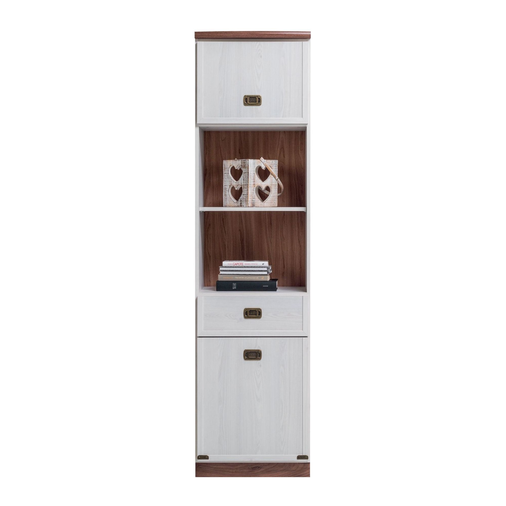 Częściowo otwarty regał z kolekcji Magic. W jego dolnej i górnej części zostały umieszczone drzwiczki, przedzielone na środku małą szufladą oraz wnęką z półką. W otwartej części możesz ustawić przedmioty godne wyeksponowania lub książki. Regał, utrzymany w takiej samej prostej stylistyce, jak pozostałe meble systemu Magic, posiada dodatkowo ciemniejsze wybarwienie we wnęce przedzielonej jasną półką. Drzwiczki regału możesz zamontować dowolnie, po wybranej przez siebie stronie.
