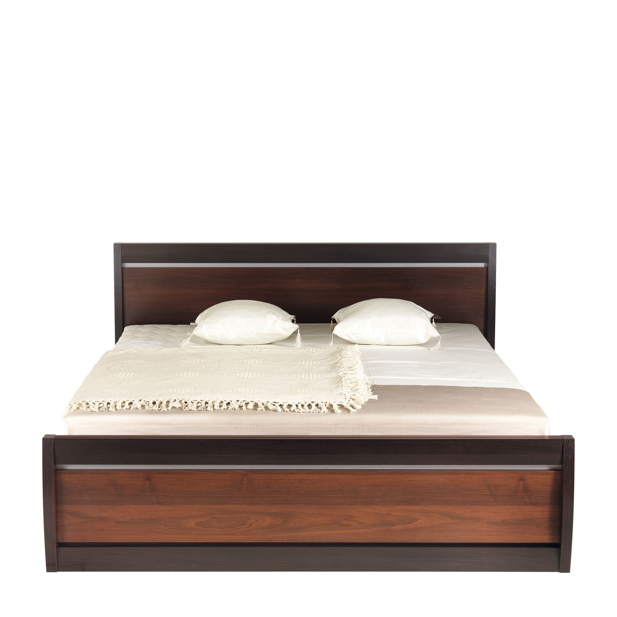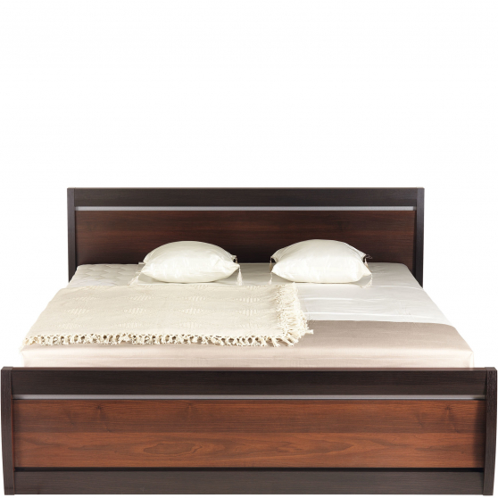 Marzysz o stylowej, eleganckiej sypialni z dużym, wygodnym łóżkiem? Wybierz to z kolekcji Forrest. Zapewni Ci nie tylko komfortowy wypoczynek, ale również wprowadzi do pomieszczenia ciepłą, przyjemną atmosferę. Łóżko zostało wykonane z wysokiej jakości laminowanej płyty meblowej o wybarwieniu orzech ciemny. Modne obramowanie zanóżka i zagłówka w kolorze dąb milano połączono ze stylową srebrną listwą i zaoblonymi bokami. Takie zestawienie daje bardzo atrakcyjny efekt. Stelaż i materac do łóżka dostępne za dodatkową opłatą.