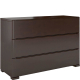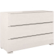 Komoda SPARTA wsparta została na subtelnych, ale niezwykle mocnych nogach, które znacząco wpływają na jej stabilność. Narożniki nóg i boczne krawędzie komody są zaokrąglone, dodając opływowego kształtu i lekkości, jednocześnie podnosząc bezpieczeństwo mebla. Górny blat jest prosty i pozbawiony zdobień, dzięki temu stanowi kolejną powierzchnię, którą możemy zagospodarować. Szuflady komody SPARTA wyposażone zostały w system cichego domyku i hamulec. Zastosowane rozwiązanie sprawia, że szuflada zwalnia podczas ostatniego etapu zamykania, domykając się cicho i miękko. Aby połączyć ascetyczną formę modelu i funkcjonalność, uchwyty to frezowane wycięcia w krawędziach szuflad (górna krawędź dolnej szuflady, dolna i górna środkowej oraz dolna krawędź górnej szuflady).