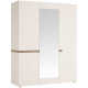 Trzydrzwiowa szafa z kolekcji Linate posiada przestronne i funkcjonalne wnętrze, które pomoże w utrzymaniu ładu i porządku w sypialni. Układ praktycznych półek na wzór bieliźniarki, oraz przestrzeń z drążkami na różnych wysokościach, zapewni łatwy dostęp do całej garderoby. Solidne wykonanie i wysoka jakość laminatu oraz płyty MDF sprawia, że szafa będzie cieszyć pięknym wyglądem przez lata. Estetyczne wykonanie przyciąga wzrok, gdyż zastosowane duetu połyskliwej Bieli Alpejskiej i dekoru Dąb Truflowy to bardzo modna i udana fuzja. Jeśli dodać do tego jeszcze duże lustro umieszczone pośrodku szafy zyskujesz doskonale rozświetloną sypialnię, co jest mile widziane zwłaszcza w małych pomieszczeniach.