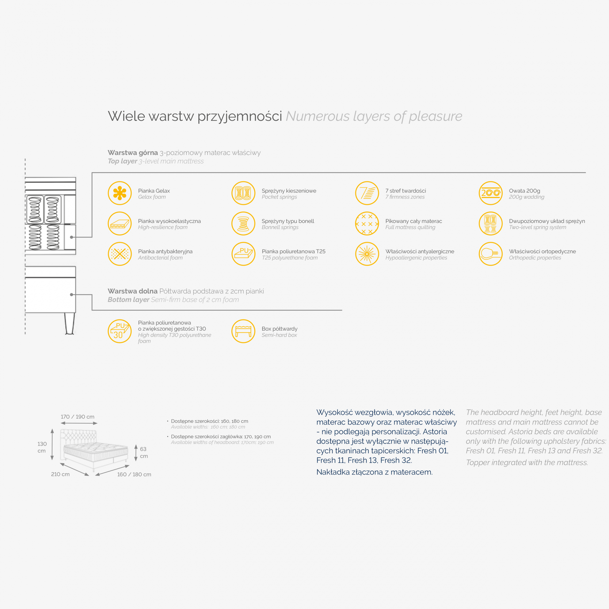 Łóżko kontynentalne zostało wykonane z wysokiej jakości materiałów. Jego piękne, gęsto pikowane wezgłowie z przeszyciami skierowanymi od najniższego rzędu pików w dół, jest bez wątpienia elementem wyróżniającym. Zdobienia idealnie współgrają ze stylowymi przeszyciami pokrowca materaca właściwego. Precyzyjne zestawienie poszczególnych warstw tego modelu zapewnia nie tylko wygodę, ale również 7 stref podparcia dla kręgosłupa.
